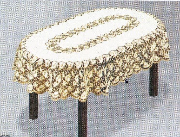 Obrusy żakardowe o szerokim ażurze naokoło, na którym zawieszone są listki z ciemniejszym obrysem. Środek dekoruje ażurowy wieniec z jednego rzędu listków. Obrusy są w kolorze starego złota, ale nie są żółte i błyszczące, jest to kolor stonowany, idący w kierunku beżu, o kształcie owalnym.