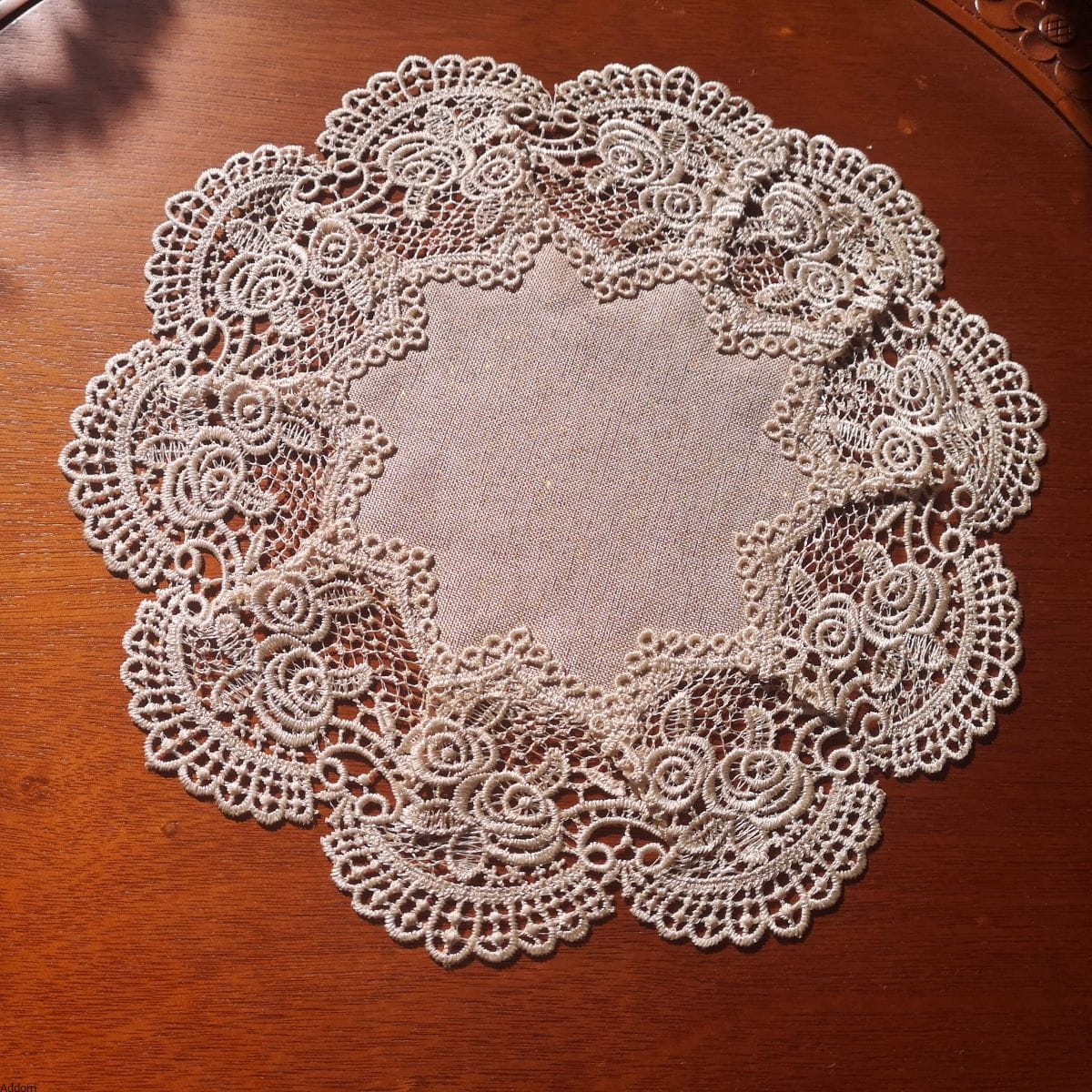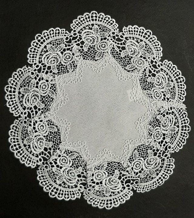 Serwetki z grubej tkaniny imitującej len, jednak z wplecioną w nią srebrną lub złotą nitką. Wersje beżowe mają złotą nić, a białe srebrną. Obrys serwetek jest finezyjny, na kształt płatków kwiatów, do których doszyta jest biała lub beżowo-złota gipiura, której wzór to różyczki. Serwetki oferowane są w 2 kolorach oraz 2 kształtach - okrągłych o średnica 30 cm i prostokątnych obiadówkach 30x40 cm. Można u nas także kupić duże obrusy na stoły z tej samej tkaniny błyszczącej i identycznej, różanej gipiury.