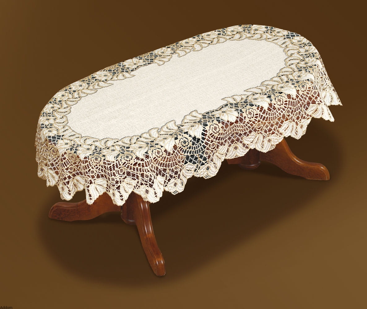Owalne obrusy żakardowe z nabłyszczanej przędzy złoto-beżowej i beżowym, stylowym wzorem naokoło pełnego środka obrusu. Wzór naokoło przypomina wzór szlaku ażurowej koronki. Nić beżowa jest lekko nabłyszczana, co sprawia, że obrus nie będzie podatny na przyjmowanie plam, będzie łatwo spieralny.