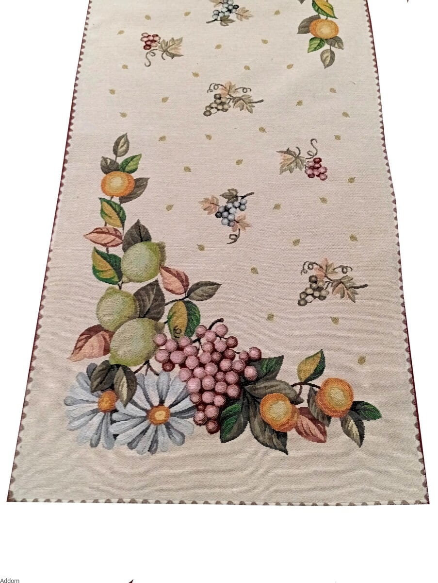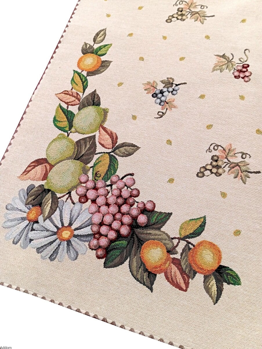 Bieżniki wodoodporne gobelinowe, polecane do kuchni, na taras lub ogrodu, w cytrynki i beżową, delikatną kratę, o bokach obciętych ultrasonicznie i podwiniętych. Dodatkowym kolorem obok żółtych owoców i kratki jest ciemna zieleń gałązeczek, kwiatuszek i winogronka. Z cytrynkami kupicie u nas wiele tekstyliów kuchennych, od obrusów, przez firanki kuchenne, po zasłony w cytrynki.