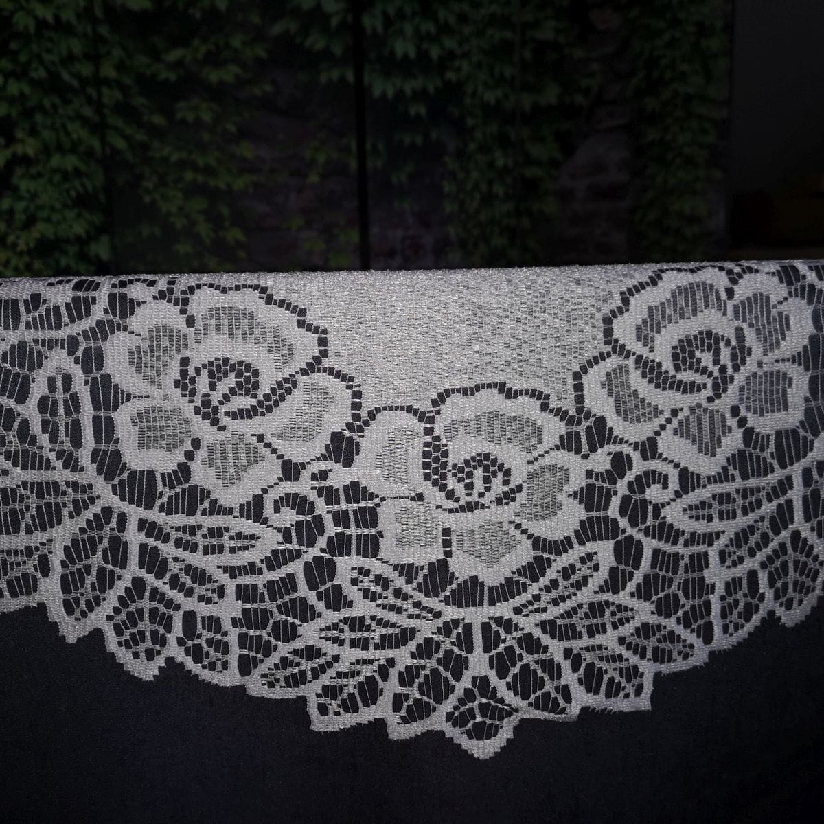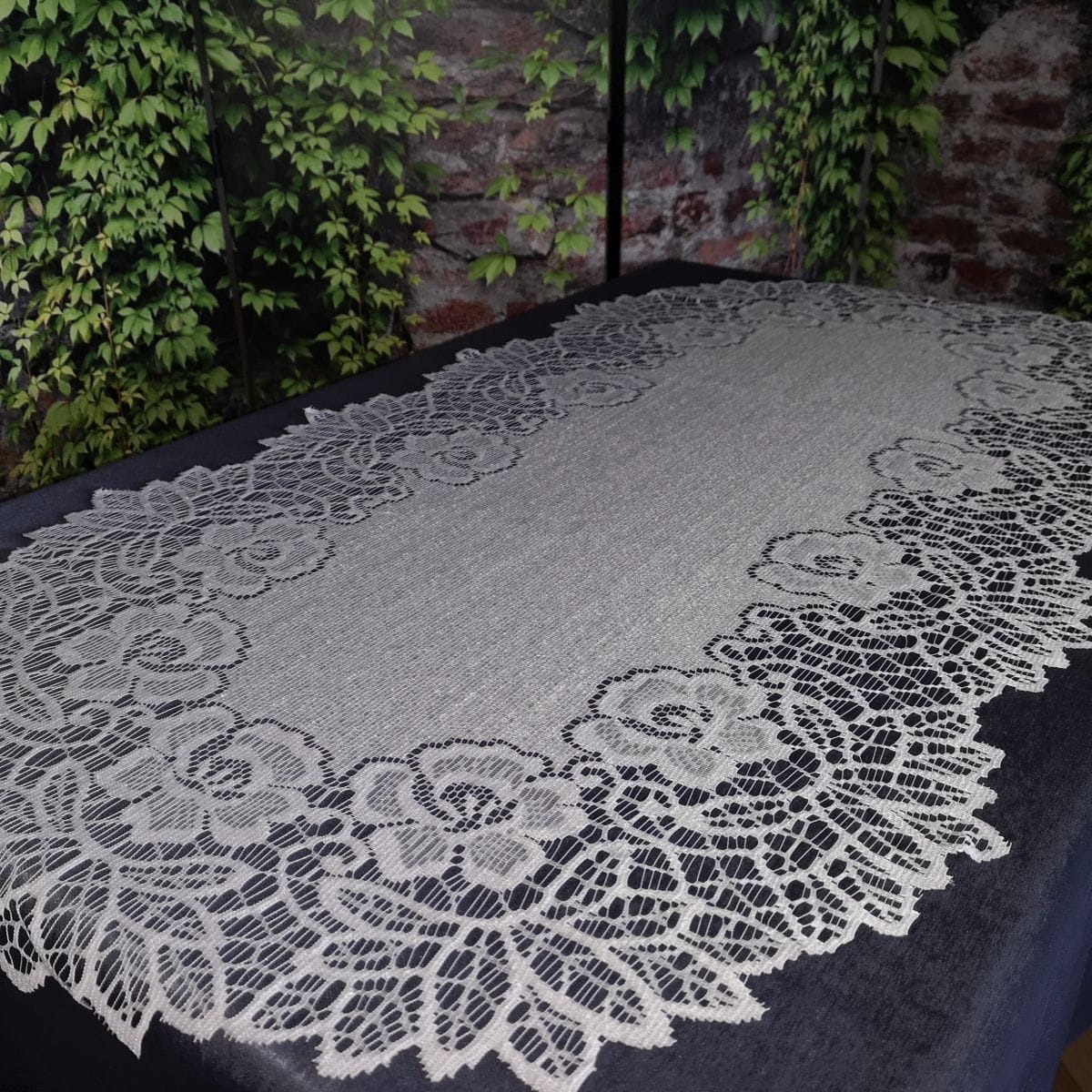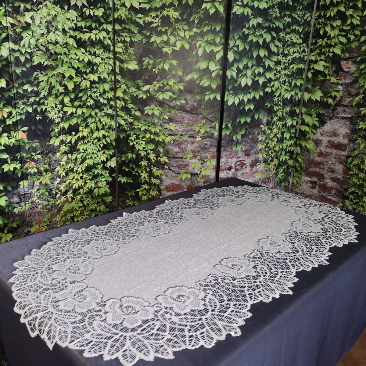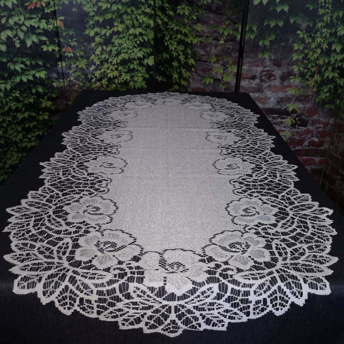 Bieżnik owalny o zaokrąglonych końcach, idealny na stół lub ławę o owalnym blacie. Kolor bieżnika biały, środek pełny, a brzegi naokoło są bardzo przejrzyste, będą cudownie podkreślać ciemny, kontrastujący blat stołu. Na zewnętrznej części dekoracji ażurowej znajdują się duże główki kwiatów piwonii. Bieżniki są żakardowe, przędza matowa, produkcja kaliska.
