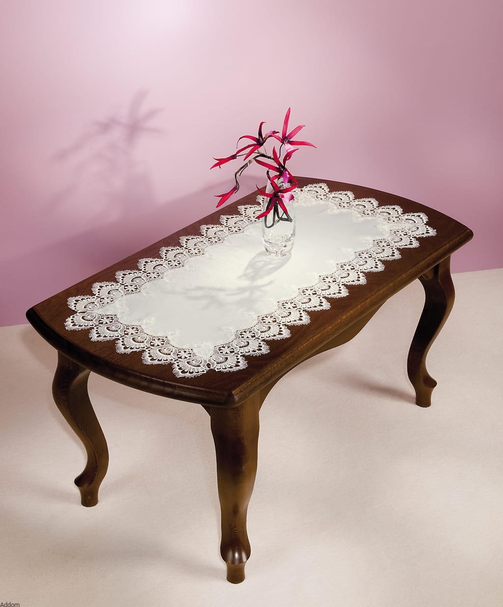 Bieżnik lub szal, w wielu rozmiarach do wyboru. Bardzo stylowe i eleganckie dekoracje stołu, z 14 centymetrową gipiurą naokoło, oraz wstawką w gipiury w tkaninie, to idealne uzupełnienie kolekcji konfekcji stołowej o tym samym numerze. Gipiura ma falowany kształt, a tkanina, do której jest ona doszyta również jest obcinana w formie fali, co dodaje im nietuzinkowej formy, mimo, że przez pracochłonność podraża koszty jego produkcji.