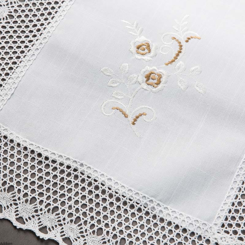 Dodaj wyjątkowy akcent do swojego wnętrza dzięki bieżnikowi wykończonemu szydełkową koronką, który łączy w sobie klasyczną elegancję i misterną ręczną pracę. To idealny wybór dla miłośników stylu rustykalnego, vintage oraz romantycznych aranżacji, gdzie liczą się detale i subtelne dekoracje. Tkaninę prócz koronki szydełkowej zdobi także haft kwiatowy.