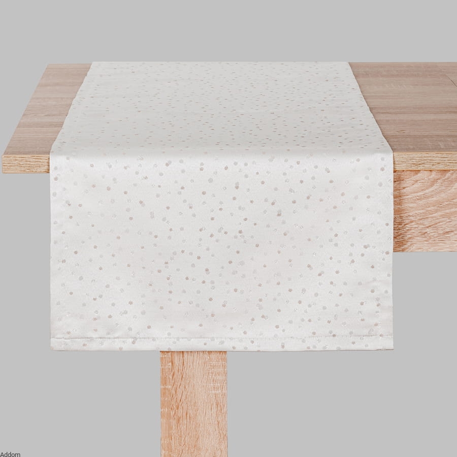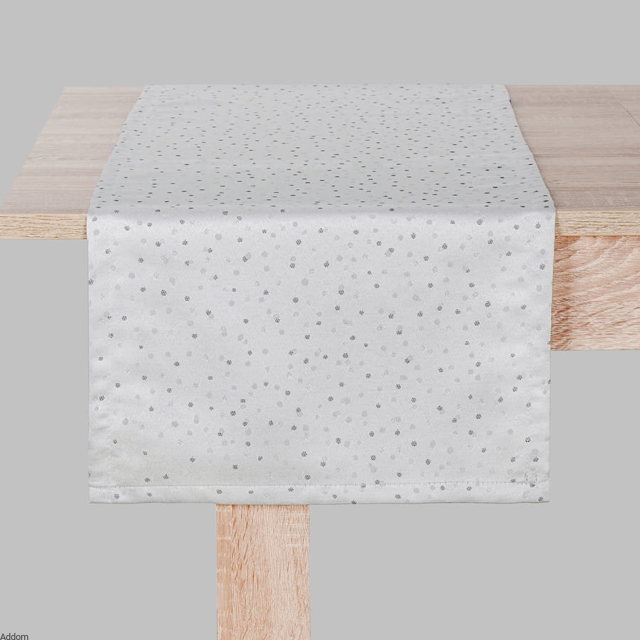 Bieżniki z błyszczącej, obszywanej tkaniny, w kolorze szarego beżu lub jasnego popielatego, z błyszczącymi srebrnymi kropeczkami na całym bieżniku. Błyszczące wzory są integralną częścią bieżników, gdyż wykonane są nicią, nie ma więc obaw, ze coś będzie się sypać, odklejać czy odpadnie po praniu, bieżniki po wyprasowaniu będą znów błyszczeć swym blaskiem. Oferowane są w 3 wariantach rozmiarów. Elegancko zapakowane - polecają się na prezent.