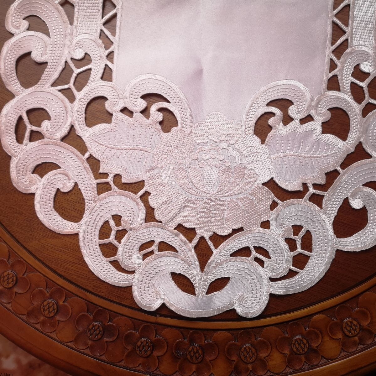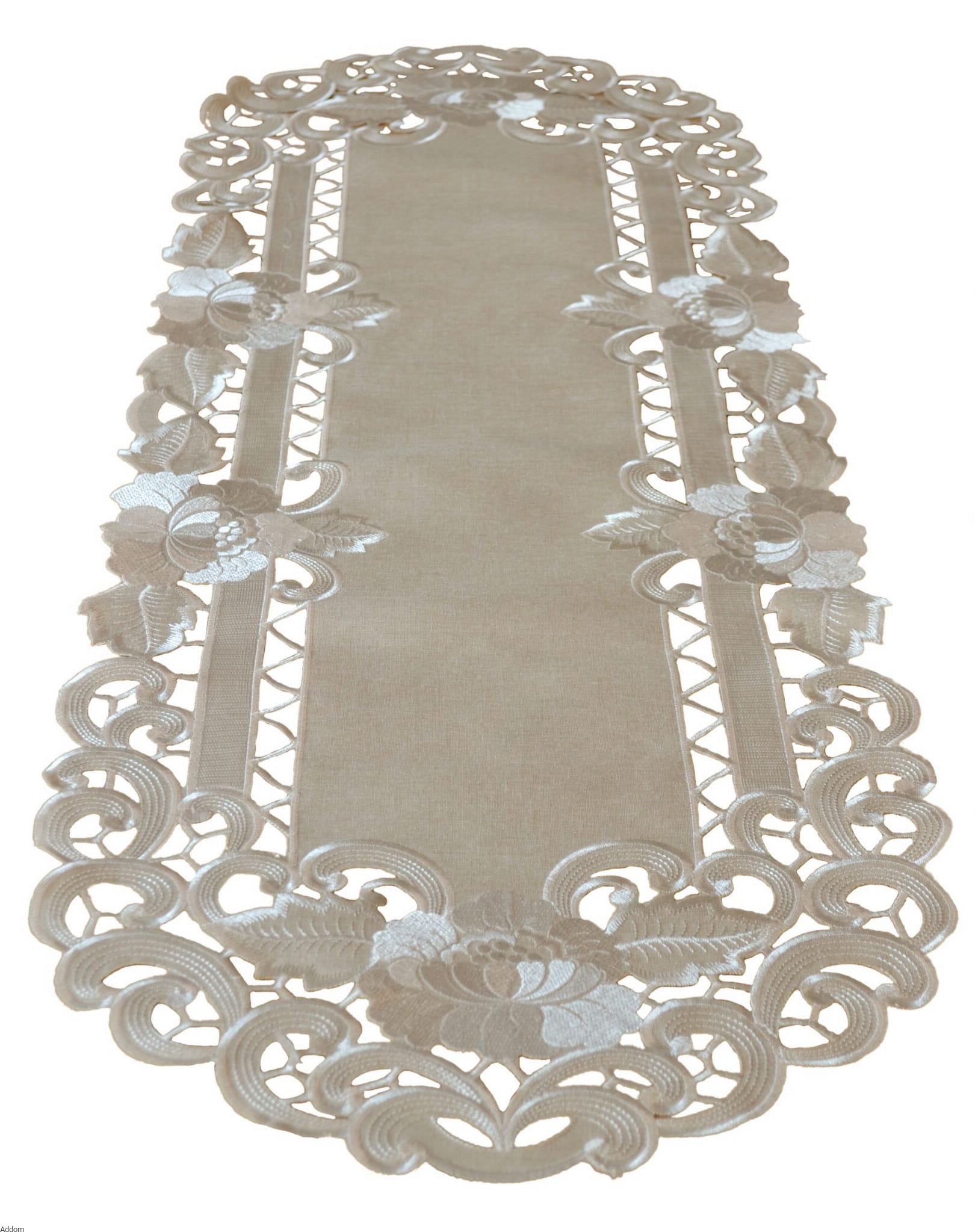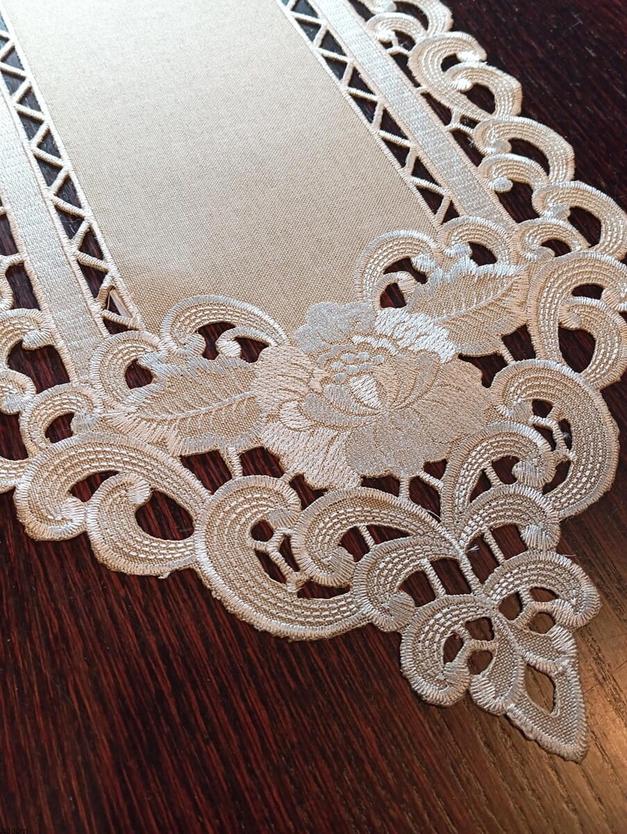Mocno zdobiony haftem bieżnik tkaninowy, w którym wzory są wycinane i obhaftowane, a taki haft nazywamy haftem Richelieu. Haft jest wyraźny i tworzy grube brzegi dekoracji. W wersji białej haft jest z białej nici, w kremowej analogicznie, z kremowej, natomiast w grafitowej wersji wzór podkreślono popielatą, błyszczącą nicią, co taje efekt srebrnego haftu. a wersja jest najmocniej kontrastująca a przez to najbardziej strojna.