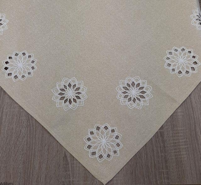 Bieżnik o wymiarach 40x140 lub 40x180 z białej, kremowej lub beżowej tkaniny, oraz kwiatami w typie kwiatów ludowych, które tworzą formy geometryczne, zgrabnie z sobą połączone i nachodzące na siebie. Być może są to gwiazdki, gdyż takie wzory można często spotkać na choinkach, wykonane ze słomy, w każdym razie z daleka przypominają formy kwiatowe, które mają środki wycięte, a brzegi obhaftowane. Tkanina wygląda jak len, a gwiazdki rozlokowane są po całym bieżniku, przy czym najwięcej jest na jego rogach. Posiadamy tylko po 1 sztuce każdego rozmiaru.
