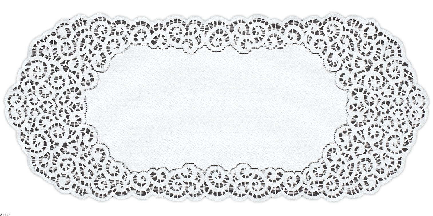 Bieżnik z materiału typu żakard, niemnący, o kształcie prostokątnym, ale owalnym, pełnym środku, który jest dość wąski i wynosi 1/2 szerokości boków, lub innymi słowy, jest tak szeroka, jak jeden z dekoracyjnych boków bieżnika, można też powiedzieć, że stanowi ona 1/3 szerokości całej dekoracji, pomijając oczywiście niuanse, takie jak forma tej dekoracji, która jest na całej linii bieżnika falowana, i regularnie w jednym z punktów bardziej wypukła a w innym mniej.