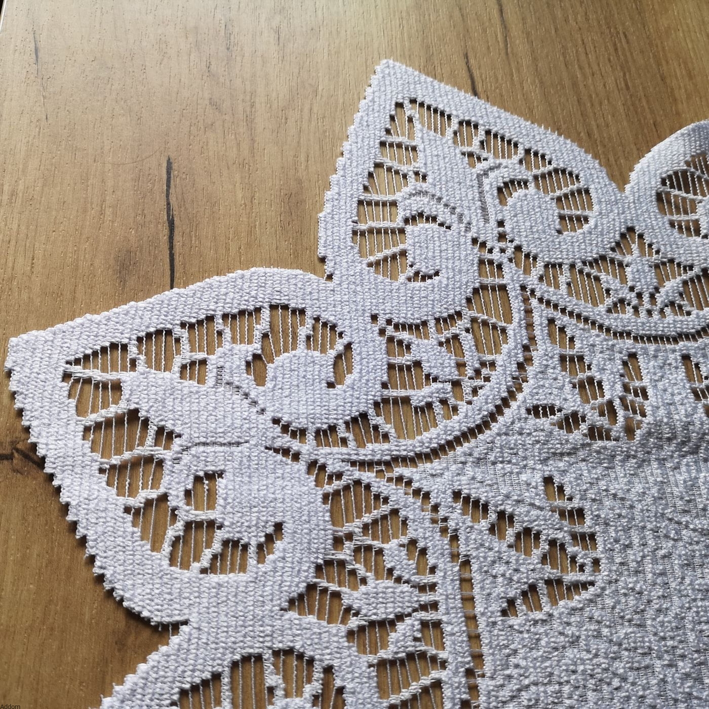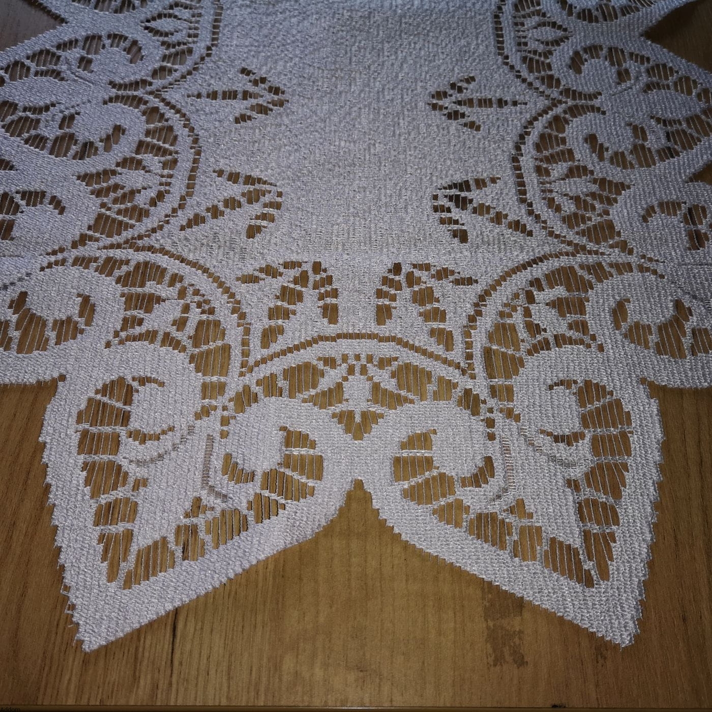 Bieżnik żakardowy biały owal, z dekoracyjnie wystającymi motywami dekoracyjnymi typu lilijka, zamkniętymi w konturze serca. Bieżnik jest lekko wypukły, wzory tworzy gęsta nić a ażur jest delikatny w tym bieżniku. Środek jest gęstym owalnym obrusikiem, z którego wystaje fantazyjna obramówka na której umieszczono motywy roślinne. Między środkową a zewnętrzną częścią znajduje się okalający środek pasek, na którym zawarte są wzory w formie okrągłych otworów oraz symboli. Wymiary: 50x120 cm.