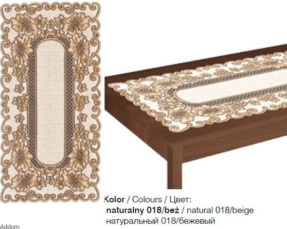 Bieżnik w duże kwiaty, które otaczają pełny, biały środek. Główkom kwiatów towarzyszy ażur, który sprawia, że bieżnik jest mocno przejrzysty, co wyjątkowo dobrze będzie wyglądać na ciemnych meblach, ciemniejszych, niż te, na których my fotografowaliśmy go, gdyż wzór zostanie podkreślony kontrastem. Bieżniki są białe, w 2 rozmiarach: 50x100 i 60x120 cm.