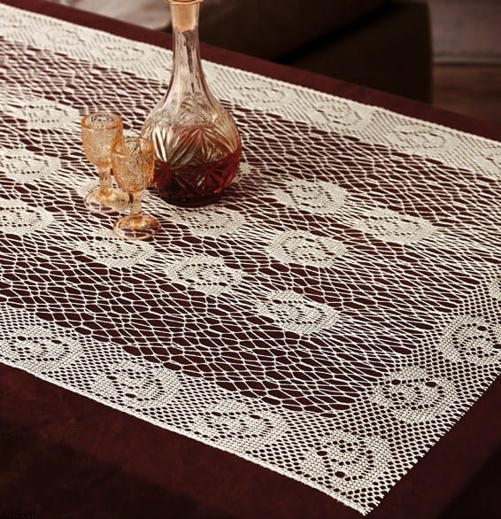 Bieżniki żakardowe o efekcie robótki ręcznej, w róże, o wymiarach 55x130 cm, z wykończeniem 2 boków w formie frędzelków. Wzory na bieżnikach to pasek otaczający prostokątny środek ażurowy, i róże, umieszczone na nim oraz na środku. Przędza jest bardzo gruba, a ścieg wygląda jakby to była robótka ręczna na szydełku. Z tym samym motywem i stylem wykonania posiadamy także firany gotowe.