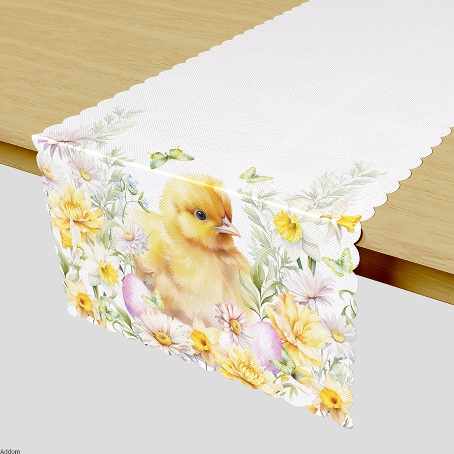 Bieżniki drukowane w kurczątka i jajeczka, lub króliczki i kwiaty, dedykowane na Wielkanoc. Bieżniki są obcinane sonicznie, bardzo kolorowe, nadruk na tkaninie jest mocno nasycony barwami. Oferujemy kilka wariantów rozmiarowych.