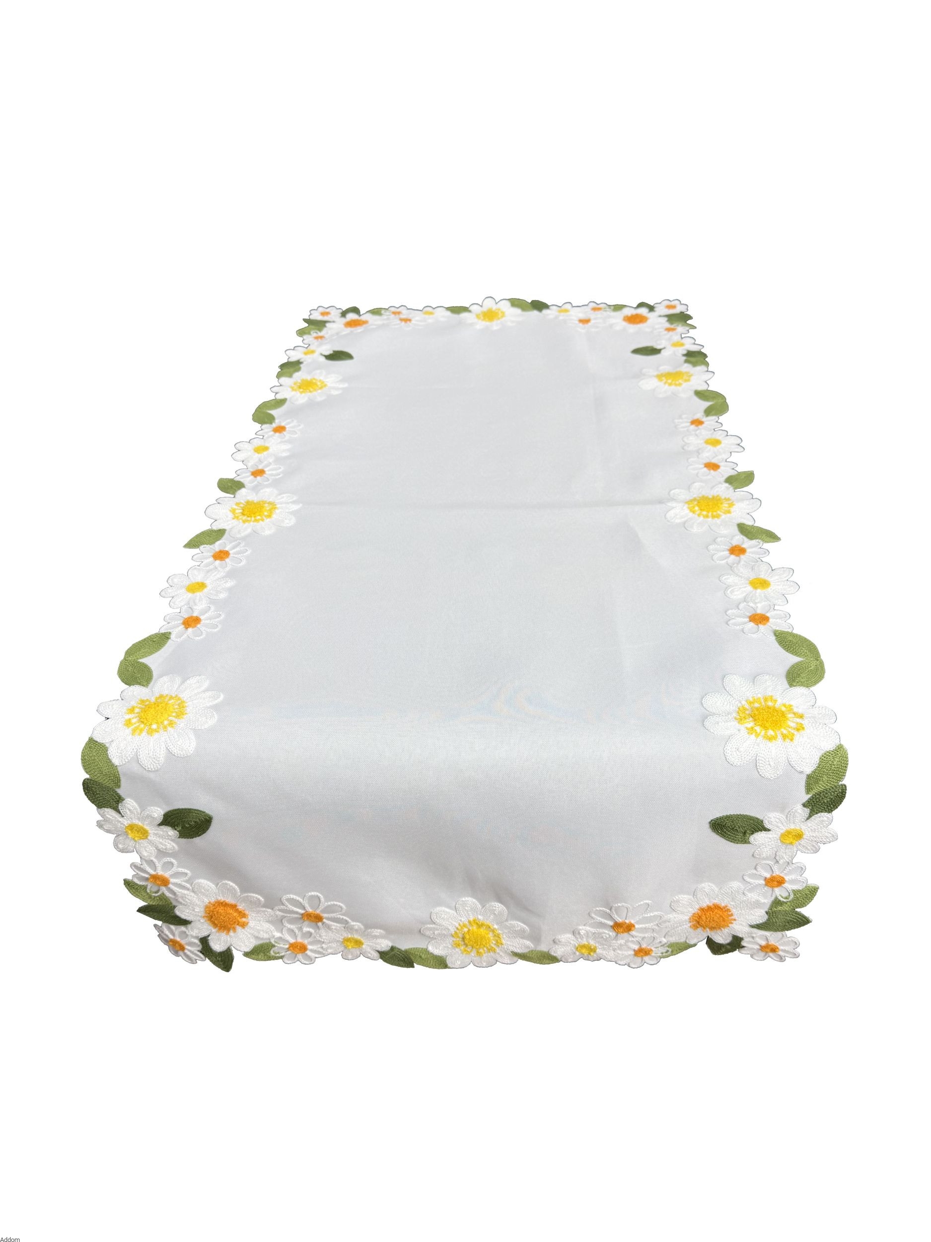 Bieżniki tkaninowe w rumianki, z haftem kolorowym w polne czerwcowe kwiaty, symbolizujące zdrowie i młodość - rumianki. Z tej serii dostępne są także poszewki z identycznym nadrukiem oraz obrusy, mamy też firany w te kwiaty, z barwionymi środkami na kolor żółty, idealne do domowej kolekcji dekoracyjnych tekstyliów w rumianki, kwiaty znane z czerwcowych wianków i polnych łąk.