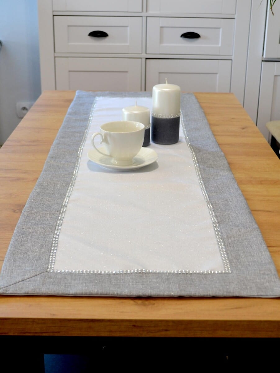 Bieżniki z diamencikami, obszyte srebrną tkaniną naokoło rzędu diamencików, naszytych na białą tkaninę obrusową. Bieżnik jest bardzo elegancki, w zimnej tonacji bieli, srebra i kryształów. Można je stosować jako samodzielną dekorację stołu, albo jako nakładka na obrus o tym samym wzorze, szczególnie pięknie wyglądać będzie taka kombinacja, gdy dokupimy do kompletu jeszcze poszewki z tej samej serii.