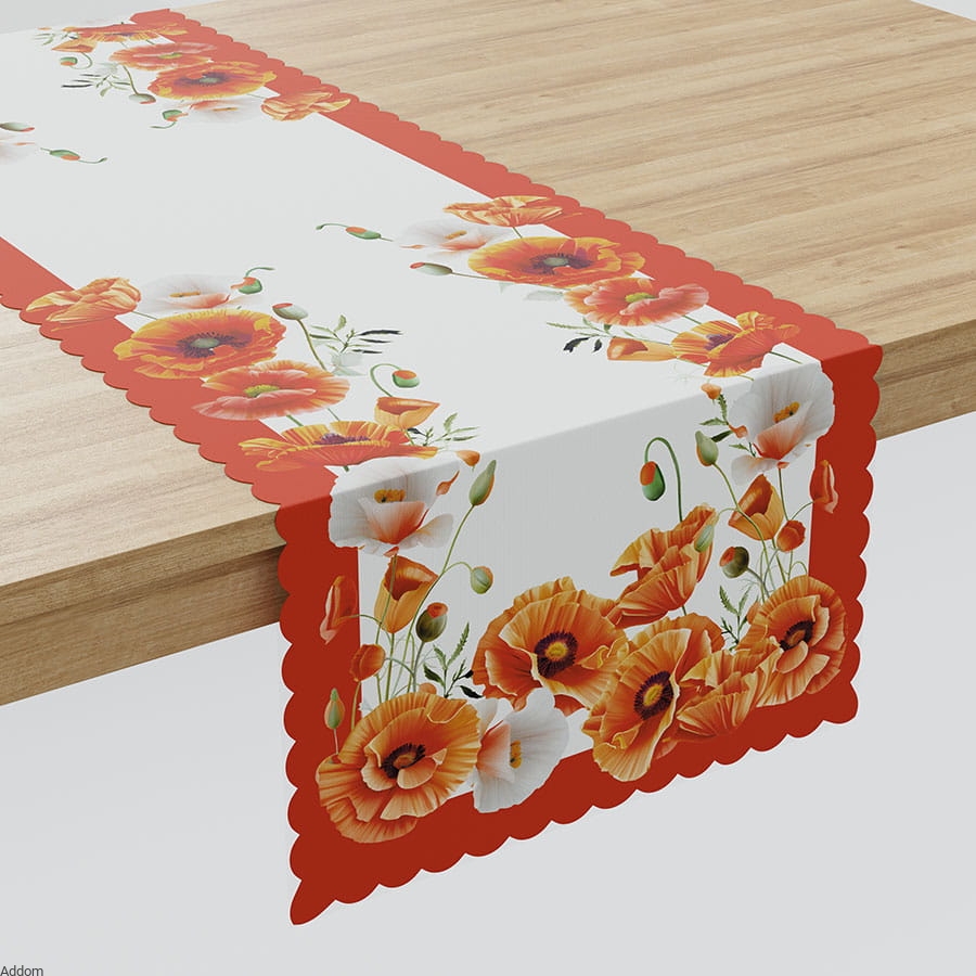 Bieżniki białe z tkaniny wodoodpornej, która nie przyjmuje płynów między nici, z nadrukiem czerwonych kwiatów i zielonych listeczków, o brzegach wytapianych laserowo na kształt małych półkoli i barwionych na soczysty, czerwony kolor.