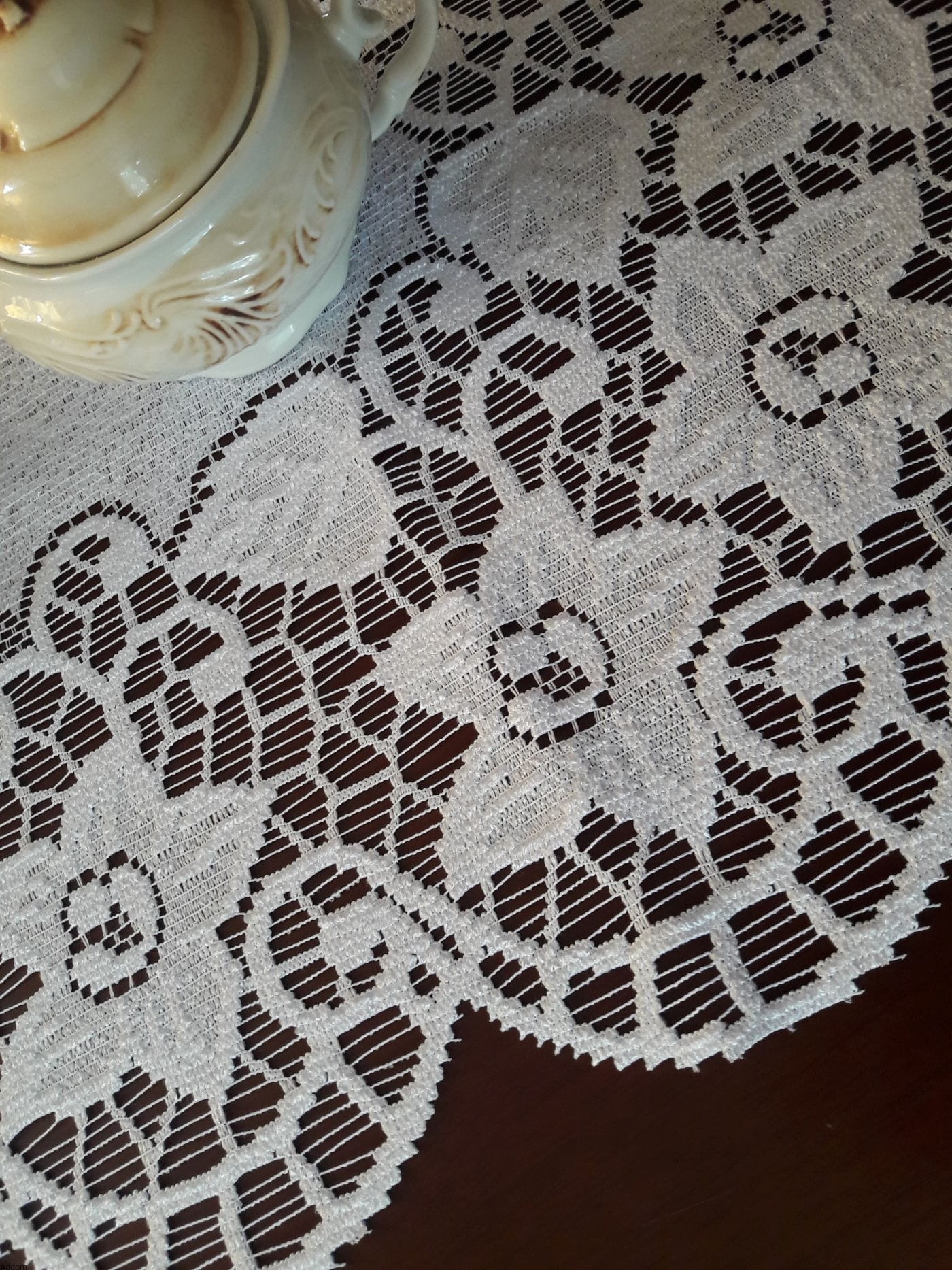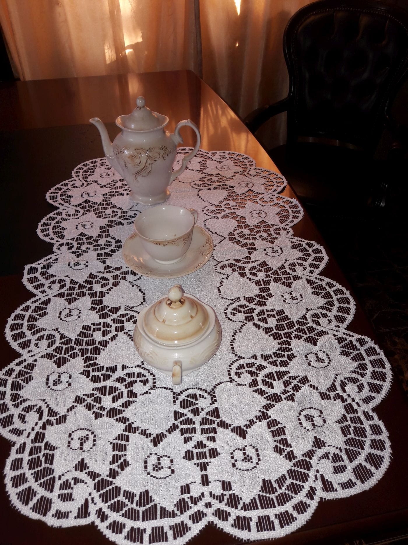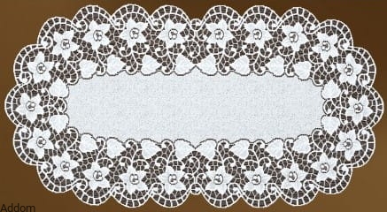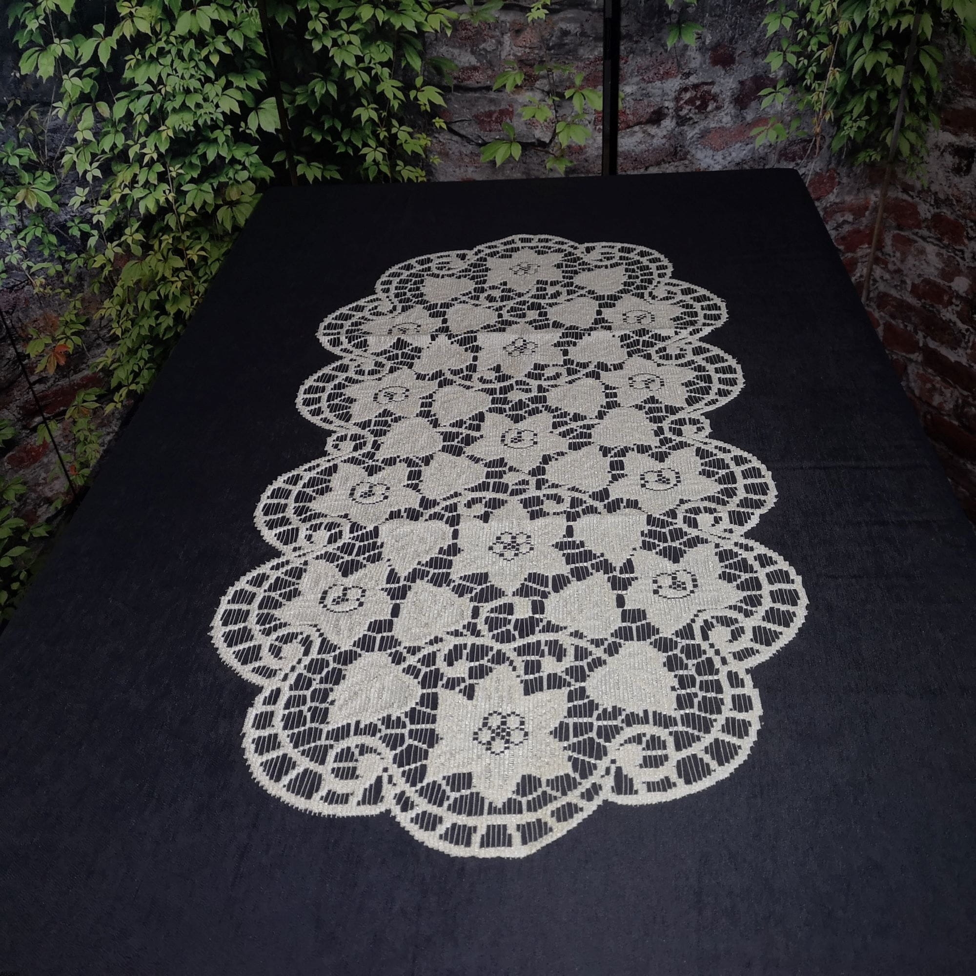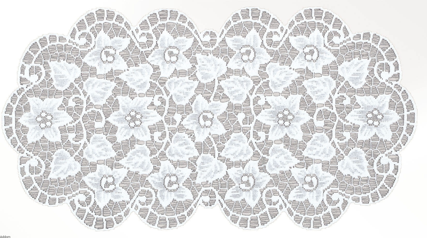 Bieżniki żakardowe w sympatyczne, proste kwiatki, dostępne w 3 rozmiarach i 2 kolorach, kwiaty są lekko wypukłe. Bieżnik ten prezentuje się w taki sposób, że dowodzi, iż zwykły, tani żakard może być urodziwy i elegancki. Część zwięzłą z częścią ażurową łączy rząd listeczków o kształcie sercowatym.
