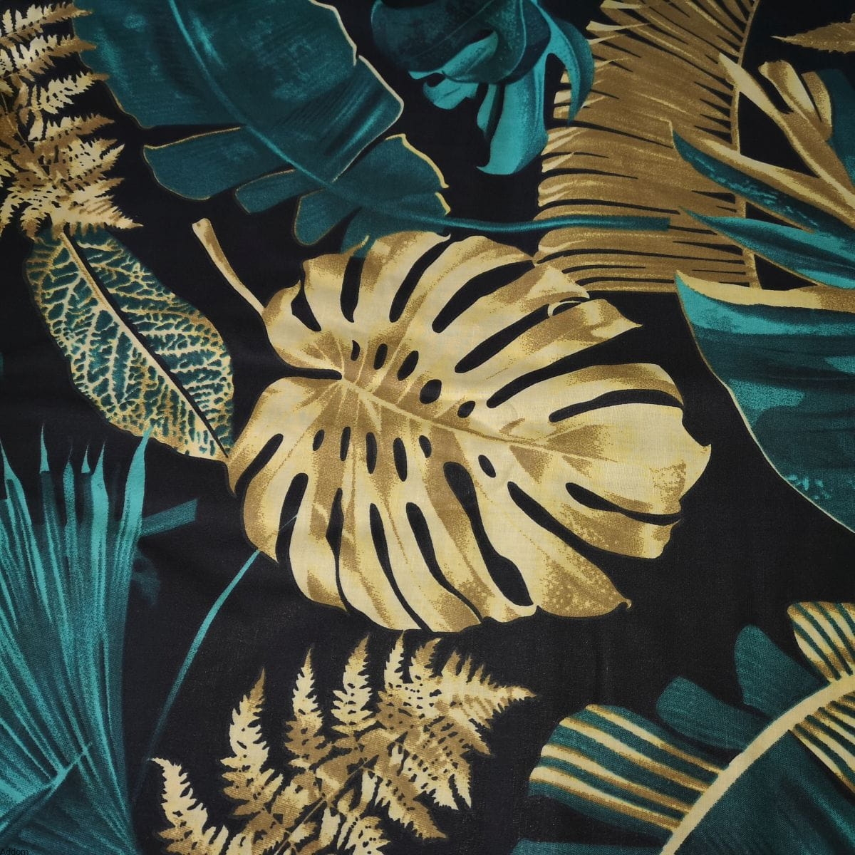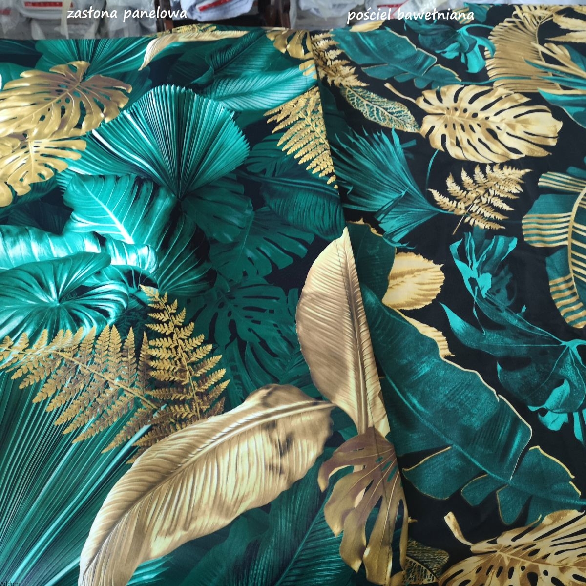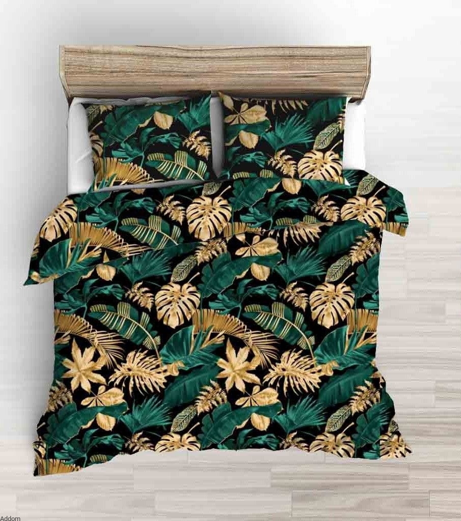 Ciemna, w kolorze czarnym, pościel 100% bawełniana, z wygładzanej nici, jak satyna bawełniana w dotyku. Pościel z obu stron jest w duże, egzotyczne liście, w kolorze mocnego odcienia morskiej zieleni i złota, z drugiej strony jest identyczna. Dane techniczne pościeli w zakładce powyżej.
