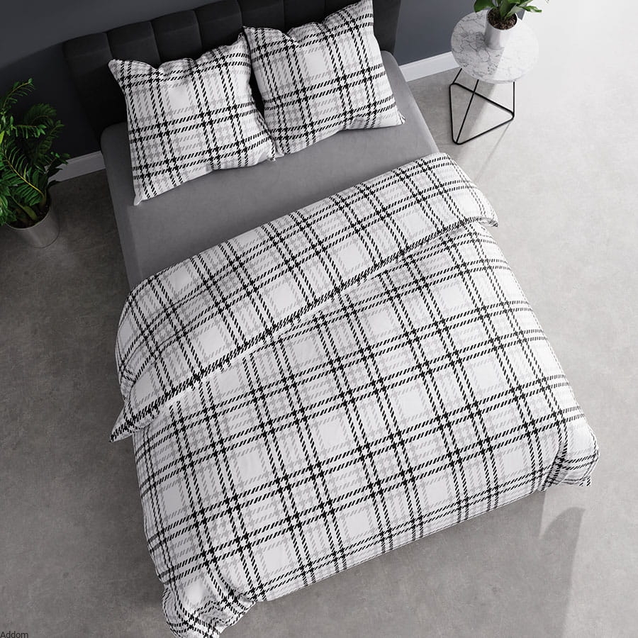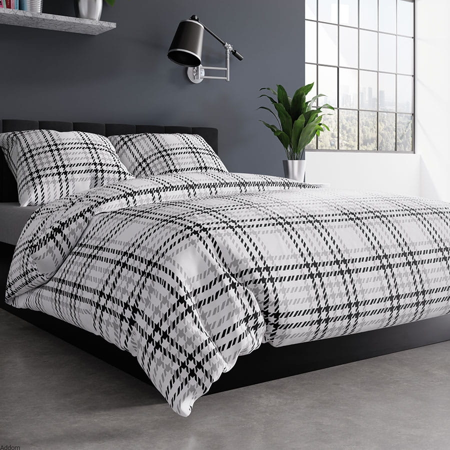 Pościel czarno biała, satyna 100% bawełniana, w której połączono zdecydowane barwy białe i czarne. Na białym tle umieszczone są motywy kraty wykonanej z czarnej i szarej linii o wzorze stylizowanym na pepitkę. Z obu stron komplet jest taki sam, czarno-biały.
