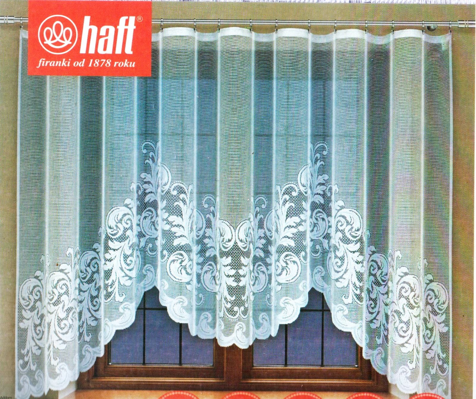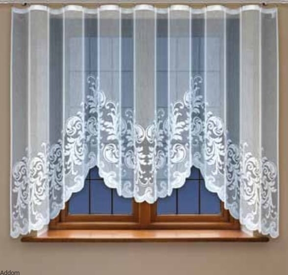 Efektowne firanki typu żakard, o eleganckim dole w kształcie łagodnej litery M, uszyta na taśmie marszczącej, a dzianina wykonana została z dość grubej nici, mimo, że jest dość przejrzysta. Ta przejrzystość daje świetny kontrast dla grubego wzoru liściowego, między liście dodany jest ażur, który tworzy wolną przestrzeń wykończoną punkcikami - gwiazdeczkami? Można się temu dzianinowemu zjawisku przyjrzeć na miniaturze. Firanki jak wszystkie firany tej firmy są elegancko zapakowane, nie powstydzicie się Państwo przeznaczyć je na prezent.