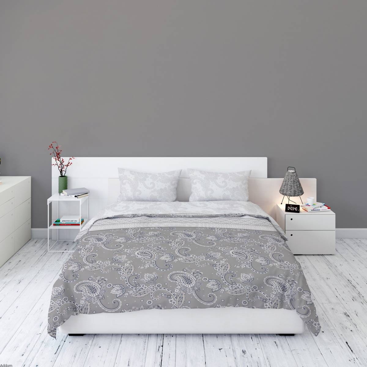 Bardzo wyszukany i ekskluzywny komplet pościeli flanelowej, z pięknymi wzorami typu paisle, eleganckimi szlakami, i pięknym, misternym zdobieniu. Kolorystyka podstawowa to szarości w dolnej połowie poszew na kołdrę 160x200 i 200x220, oraz biały, dominujący w górnej części. Na poduszkach 70x80 cm delikatniejszy wzór paisle. W szarej części pościeli dołożone są eleganckie formy, do których dodano odrobinę koloru, który rozróżnia warianty na wersje kolorystyczne.
