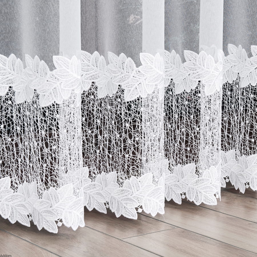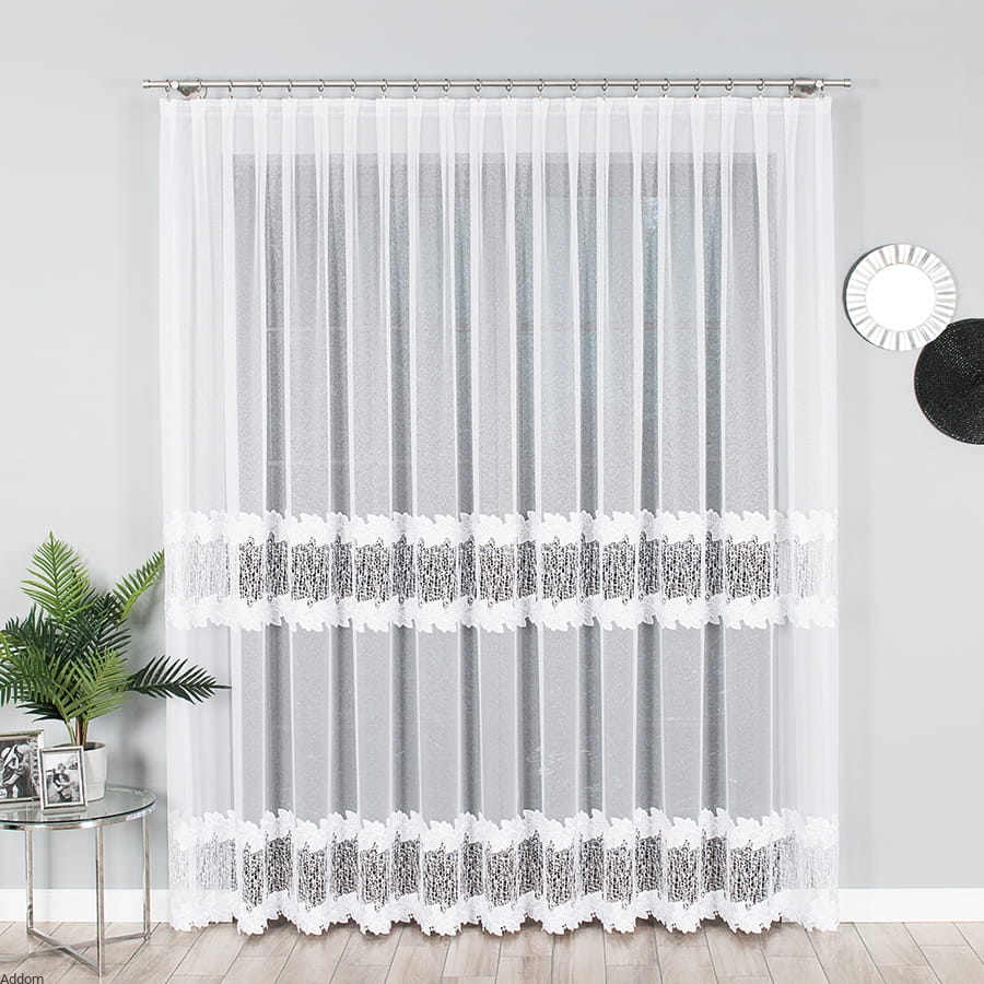 Firany te sprzedawane są na metry, a oferowane w trzech wysokościach: 160 i 250 cm. W firanie o wysokości 250 cm występują 2 pasy gipiury, która ma aż 40 cm szerokości, a pasy gipiury znajdują się od siebie 56 cm. Górny pas kończy się na wysokości od 135 cm od podłogi, więc będzie dobrze widoczny w oknie. Wersja krótka na 160 cm ma ten sam pas ale tylko jeden, i wykończa on firanę dołem.