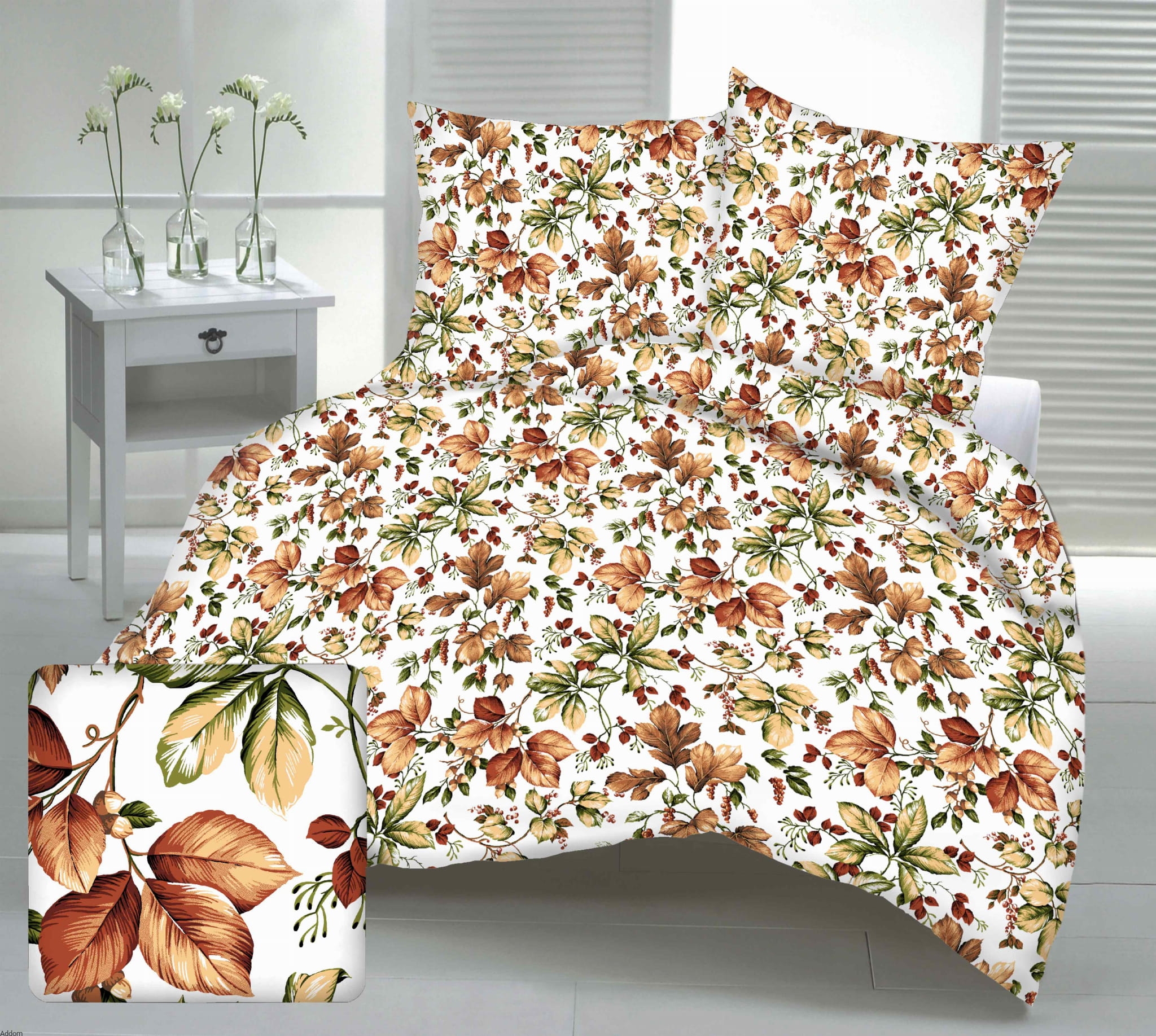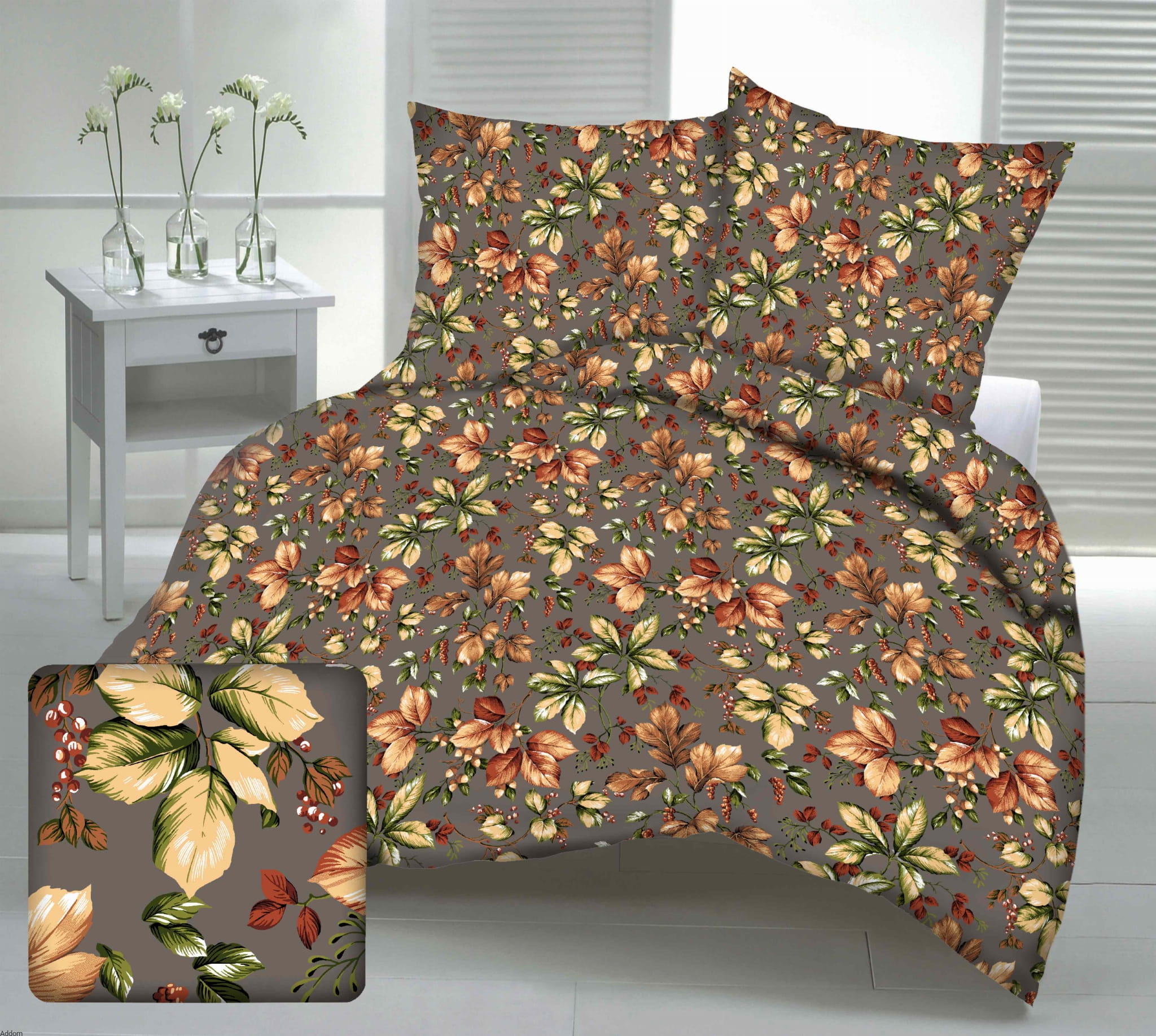 Pościel flanelowa o eleganckim i dość klasycznym design w listki, gdzie większość wzoru stanowi jaśniejsze tło pokryte sporymi, jesiennymi listkami, o odcieniu mocnej szarości, grafitu. Pościel dekorowana gałązeczkami z listkami nastraja jesiennie. Wszystkie poszewki i poszwa w tym 3 częściowym komplecie zapinane są na zamki.