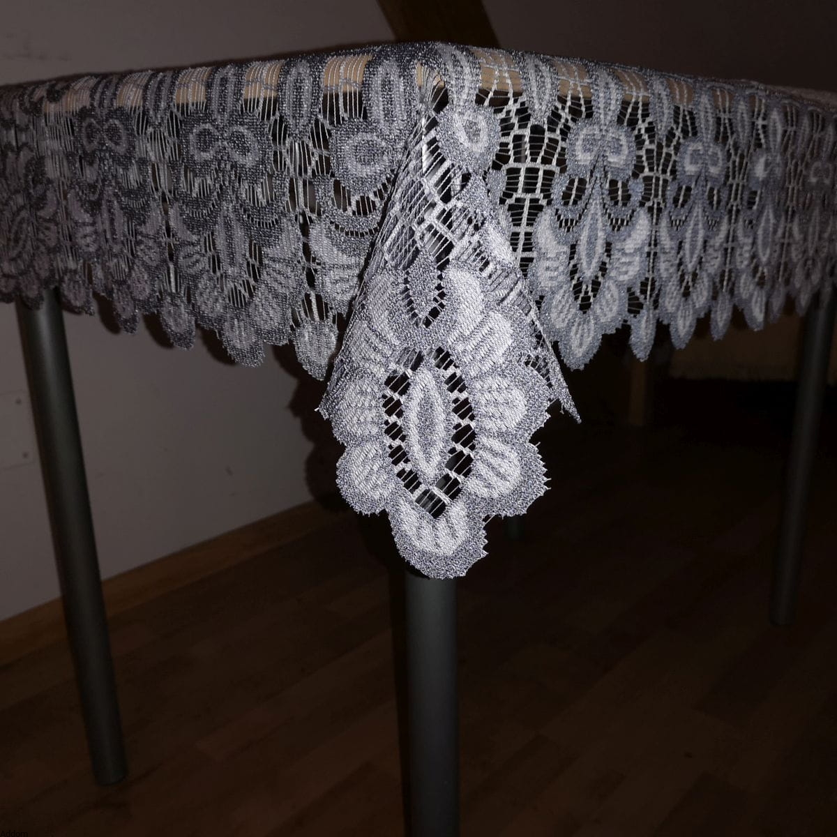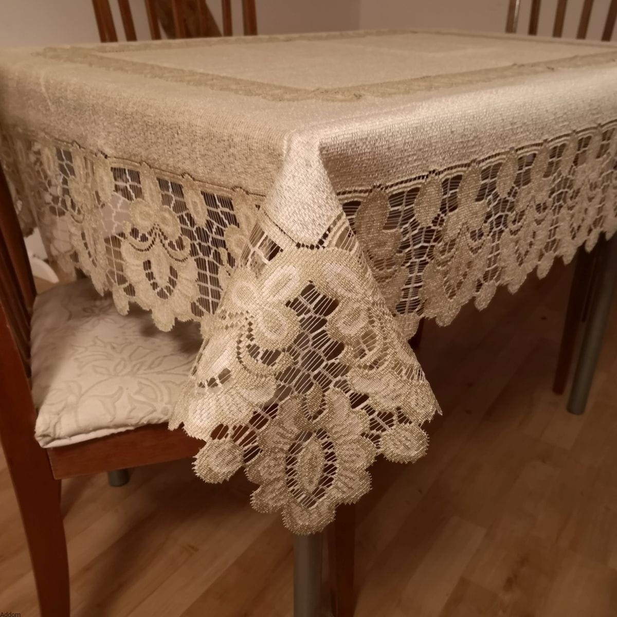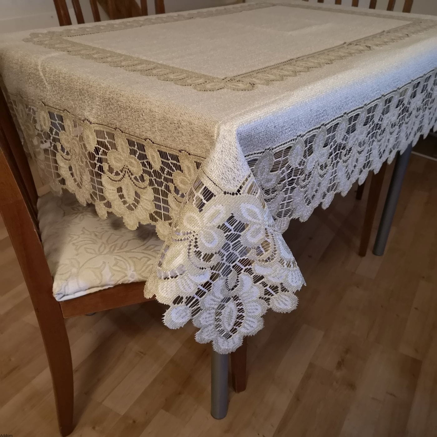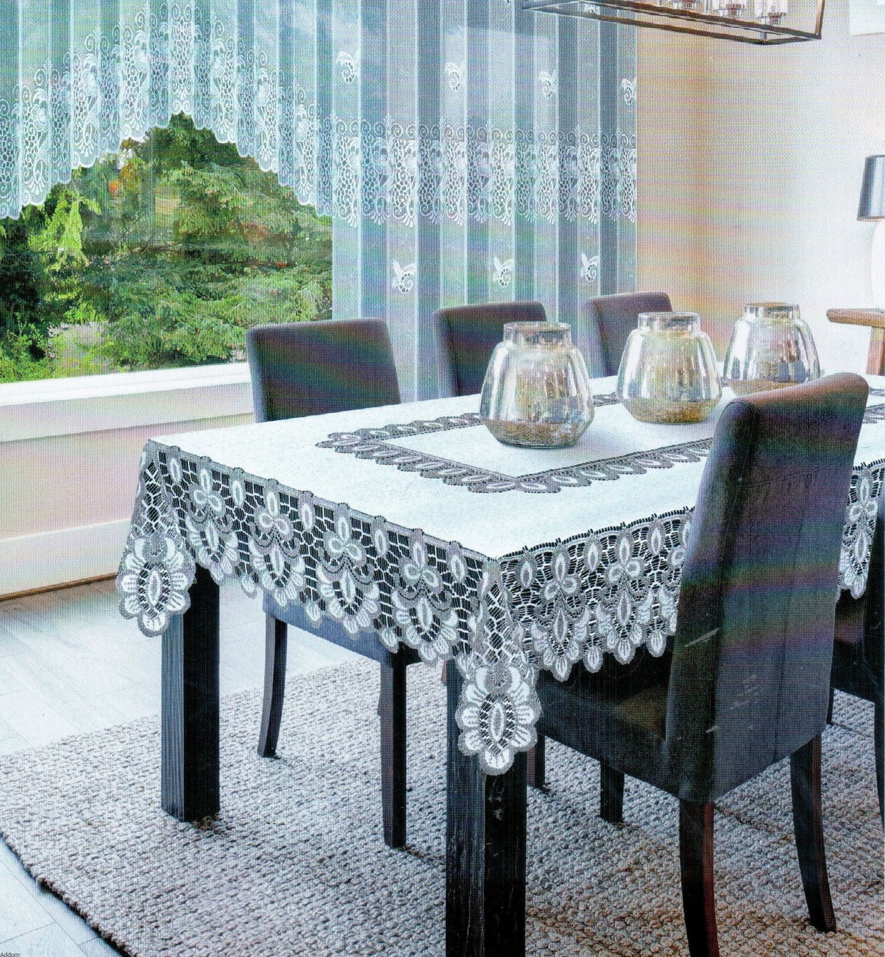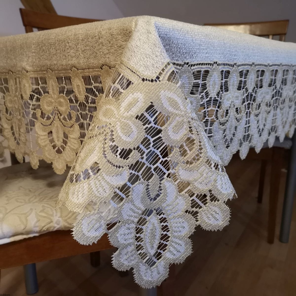 Bardzo eleganckie żakardy kaliskie, w formie dwukolorowych obrusów, biało - szarych lub kremowo - beżowych. Jasne tło, białe lub kremowe jest zwięzłym materiałem, zaś dekorujący obrusy ażur ma kolor szary lub w ciepłym odcieniu beżowo - złotym. Dekoracyjna bordiura otacza brzegi obrusa oraz węższym pasem dekoruje środek, wyglądając jak położony na obrusie bieżnik. Ażurowa bordiura obrusów nie jest jednokolorowa, przez co nie wygląda na zbyt ciemną. Tylko obrys wzoru jest ciemny, wypełnienie wzoru jasne, zarówno w wersji złotej jak i białej, jednak wariant biało - szary jest bardziej kontrastującą kompozycją niż kremowo - złoty.