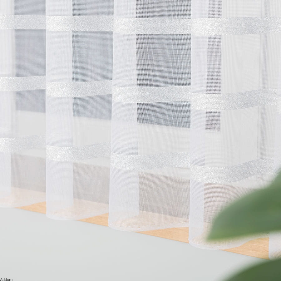 Paski wykonane są nicią typu Lurex, nie są nadrukiem. Te srebrne niteczki są wyraziste i również wyglądają bardzo naturalistycznie. Paseczków w dolnej części firany jest 5, mają 2 centymetry szerokości i znajdują się w odległości około 6 cm od siebie.