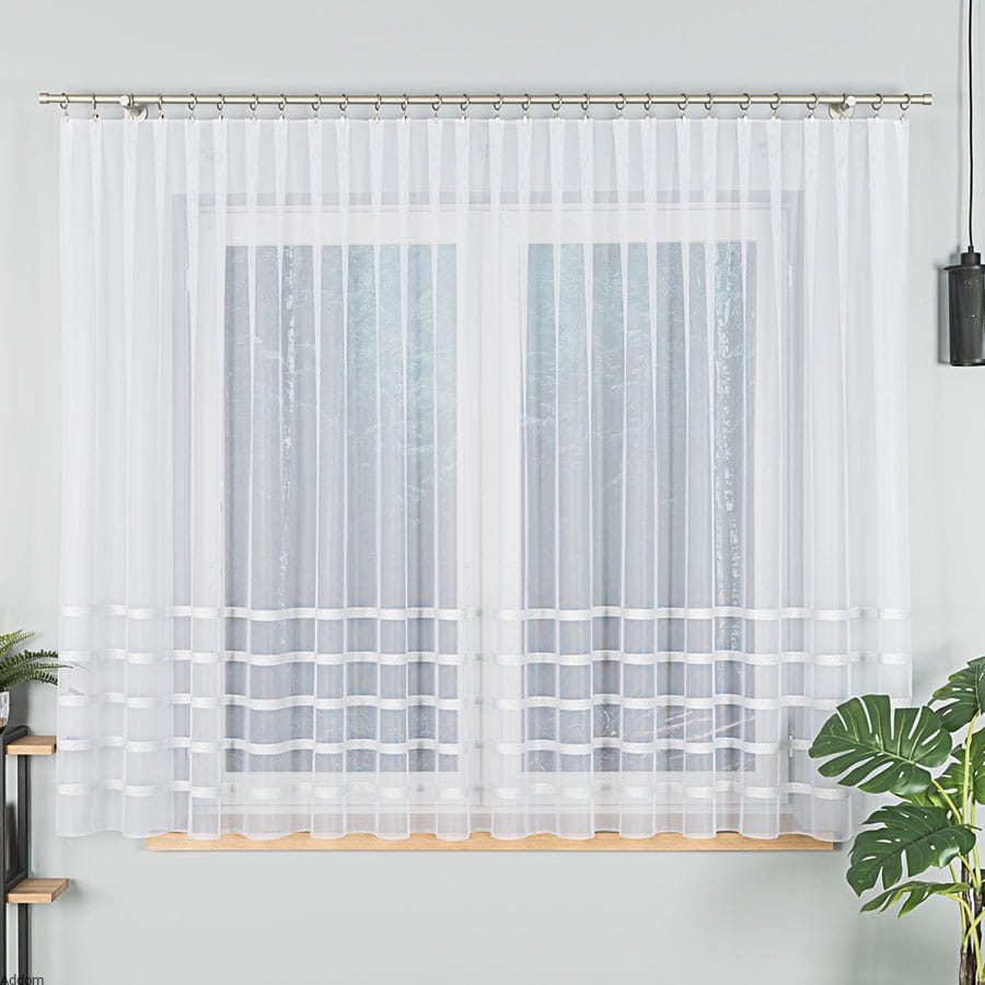 Firana salonowa z tkaniny o bardzo minimalistycznym wyglądzie, dlatego nadająca się również do innych typów pomieszczeń, obciążona ołowianką dołem, w srebrne pasy, które dekorują dolną połowę firany. Tło jest bardzo przejrzyste.