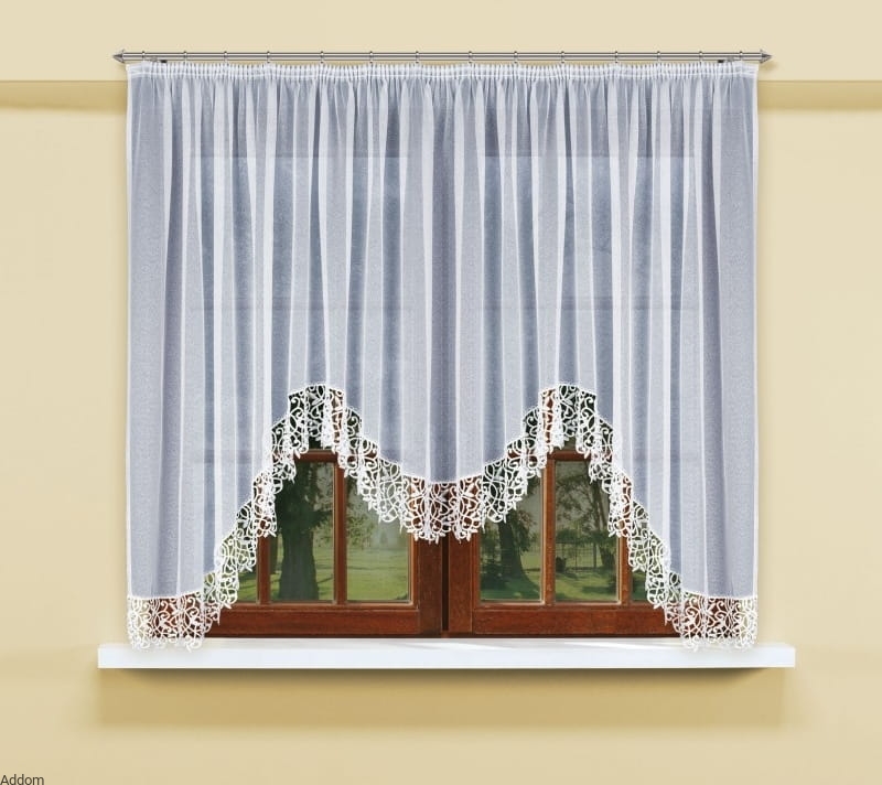 Zgrabna firana o dość nowoczesnym kroku, uszyta z najlepszej jakości woalu i grubej gipiury, w polskiej fabryce firan z Kalisza. Firany mają w sobie wiele elegancki i wdzięku, dedykowane są do salonów, ale również elegancka kuchnia z radością przyjmie tak piękną dekorację. Firana dołem wycinana jest w falę, następnie po obwodzie obszyta kilkucentymetrową gipiurą, która tę falę uzupełnia. Górę wykończono szeroką, prosto marszczącą taśmą 1:2. Szerokość 400cm przy taśmie marszczącej 1:2 da wymiar użytkowy około 200 cm, plus/minus 20 cm karnisza również będzie odpowiednie do tej firany.