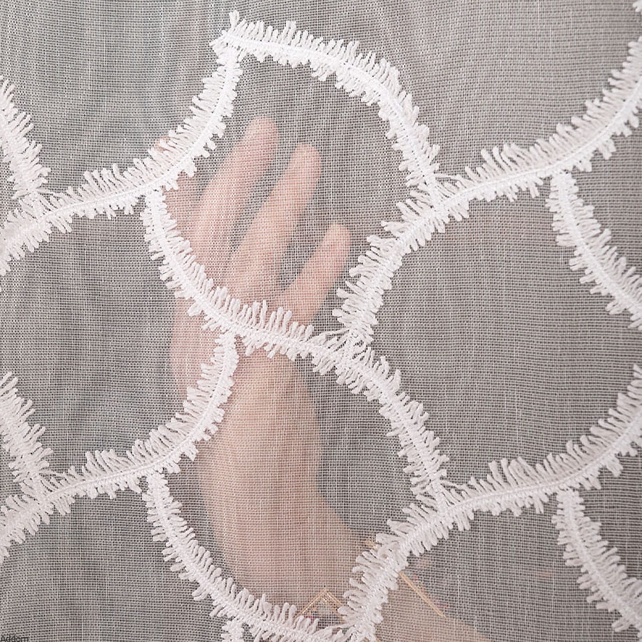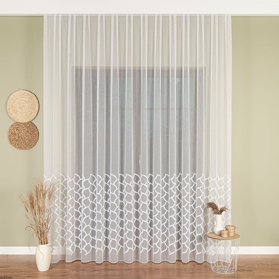 Dodaj elegancji i wyjątkowego charakteru swoim wnętrzom dzięki firanie z grubym haftem przestrzennym na dole. Wykonana z wysokiej jakości materiału, subtelnie przepuszcza światło, tworząc przytulną atmosferę, jednocześnie zapewniając prywatność.