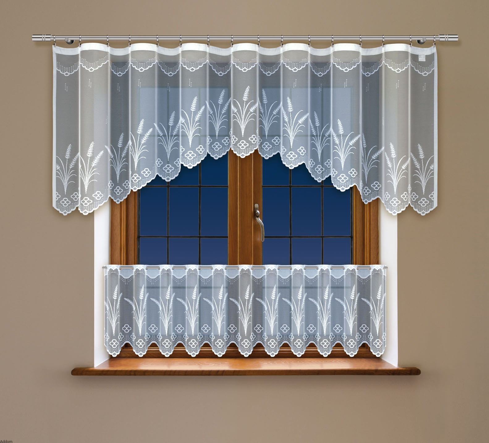 Białe firanki dwuczęściowe z wzorem lawendy z łodyżkami, proponujemy jako firanki do kuchni. Firanki są z żakardu, dlatego są dość przejrzyste i przewiewne. Firanka jest ładnie zapakowana, może być prezentem dla właścicielki kuchni prowansalskiej lub innej rustykalnej aranżacji. Wymiary: wysokość w najdłuższym miejscu górnego elementu 80, dolnego 45 cm, szerokość przed umarszczeniem obu elementów 300 cm.