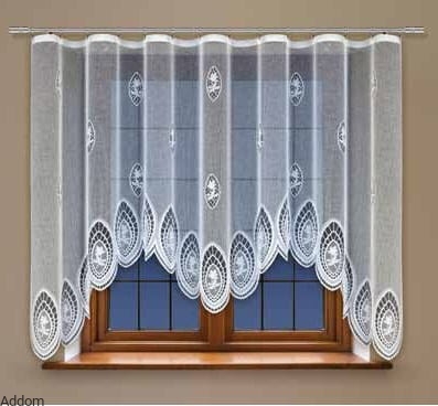 Ciekawe firany gotowe z Kalisza, o wzorze w formie medalionów wypełnionych w środku kwiatem, i ciekawym kroju. Szczególną uwagę zwraca dół, jest on bardzo dekoracyjny, w przeciwieństwie do delikatnej góry, nie tylko przez wzory, ale także przez ciekawą linię fasonu na dole, ponoszącej się w 2 miejscach firany. Te firaneczki produkowane są aż w 6 rozmiarach, wszystkie uszyte na taśmie marszczącej, a więc można je wieszać na żabkach, haczykach, a nawet cienkim karniszu, wsuwając go między taśmę a firanę.