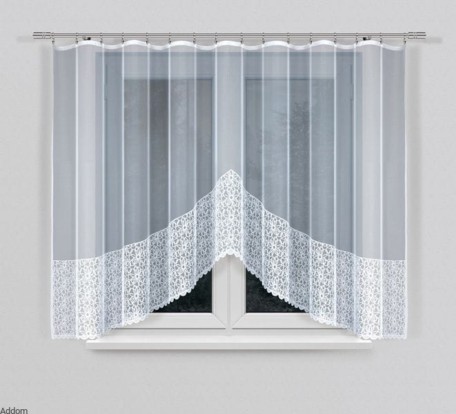 Firanki gotowe minimalistyczne ale na swój sposób zwracające uwagę i nietuzinkowe, które górę mają bez wzoru, w drobną krateczkę o średnio dużych okach, dołem po łuku biegnie szeroki dekoracyjny szlak ażurowy, zawierający małe spiralne motywy zdobnicze. Firanki są uniwersalne, fason będzie stosowny do zastosowania w wielu rodzajach pomieszczeń. Wymiary: wysokość 160 cm, szerokość 300 cm. Firaneczki ładnie zapakowane, można przeznaczyć na prezent. Mają także wszytą taśmę marszczącą.