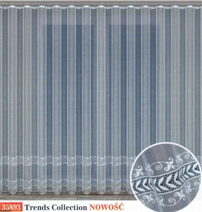 Szeroki wzór wykończający to 2 szlaki równomierne, biegnące równolegle, zwracające uwagę, będące połączeniem zarówno motywów roślinnych jak i szlaków geometrycznych. Kolekcja, z jakiej pochodzi ta firana to Trends Collection 2024/2025.