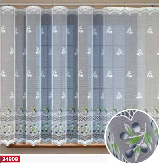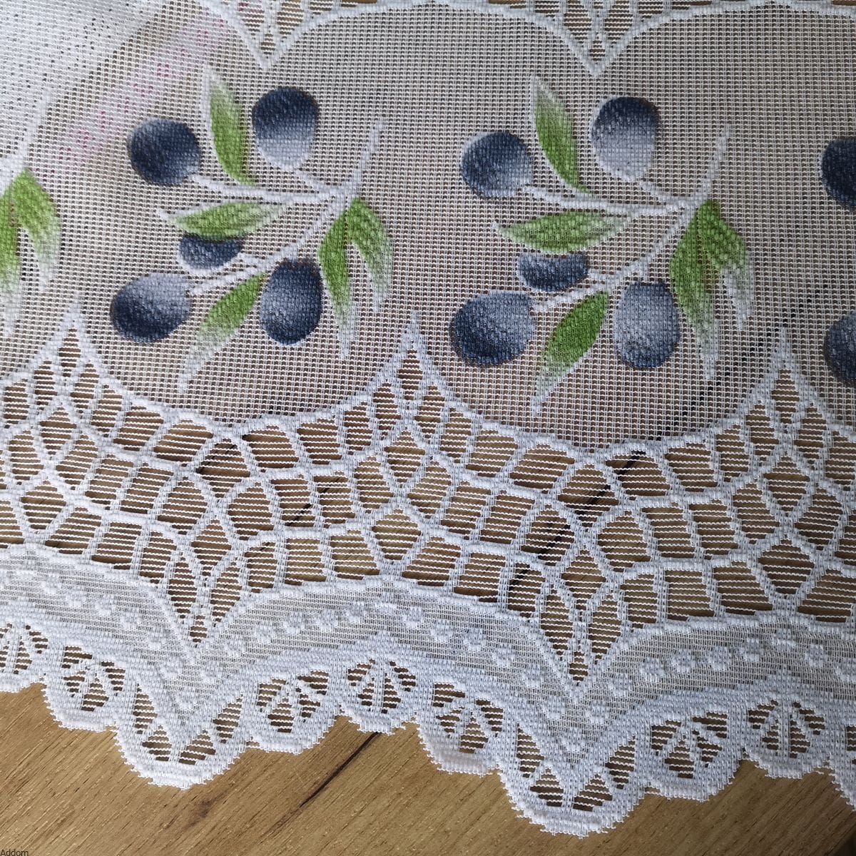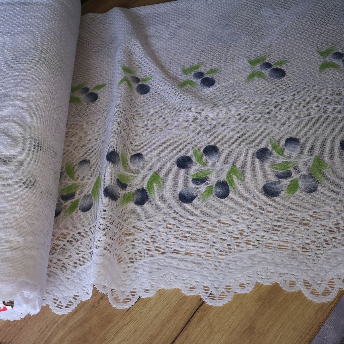 Firanki do kuchni, kolorowe, o wysokości 110, 130 i 160 cm, żakardowe, malowane ręcznie, sprzedawane na metry. Wzory to gałązki z śliwkami węgierkami, a między rzędy kolorowego wzoru wkomponowany jest duży ażur o ciekawej formie. Firanki są kolorowe tylko dołem, wyżej znajdują się mniejsze, białe motywy z owocami śliwek.
