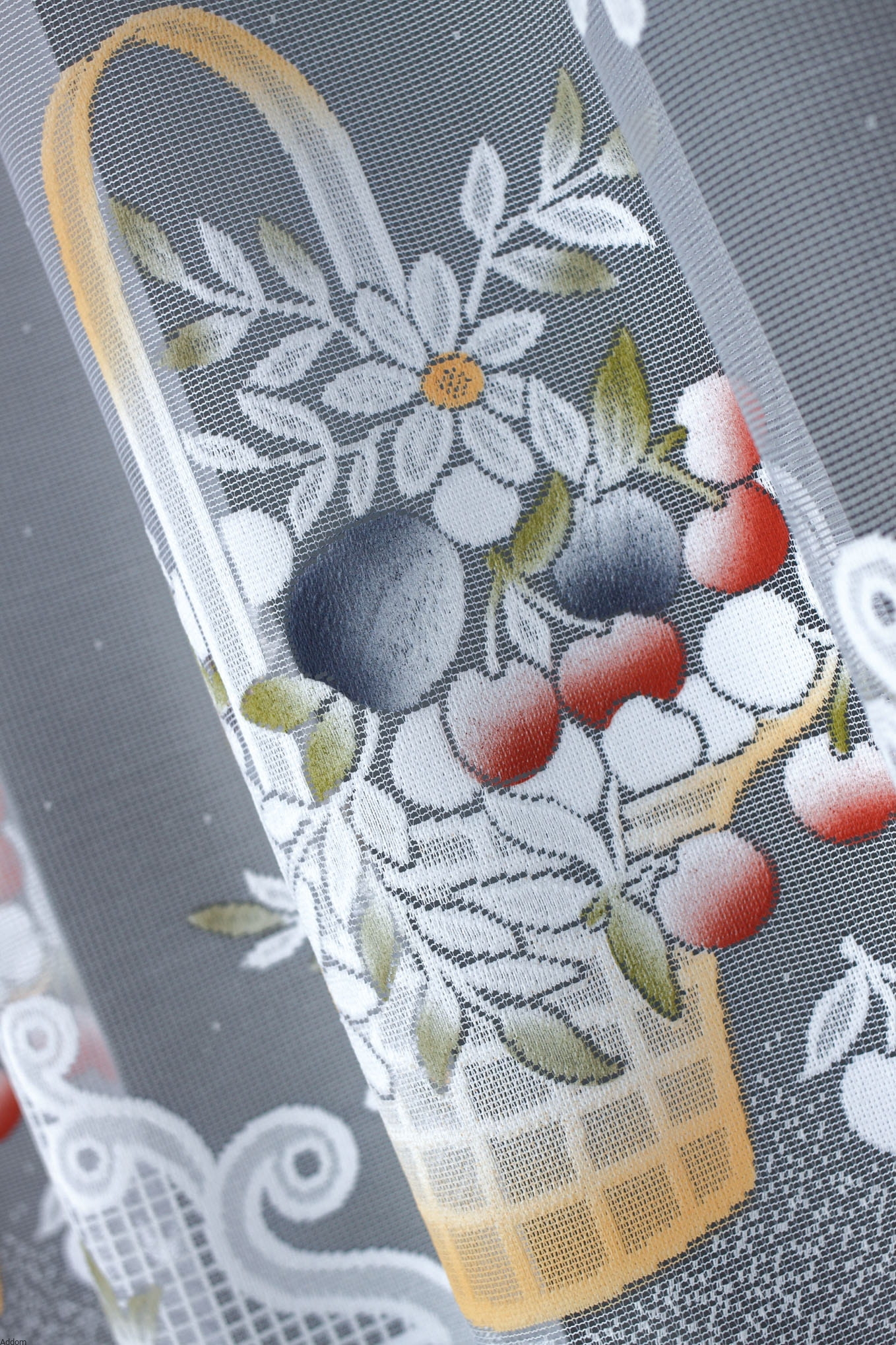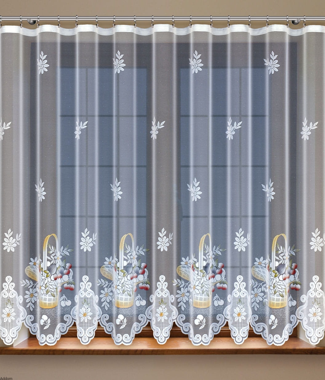 Lekkie firany bardzo kolorowe, do malowania których użyto kilku barwników, w tym zielony, żółty, śliwkowy fiolet i czerwony, a motywy dekoracyjne to duże kosze wypełnione kwiatami i owocami, ponadto między koszami umieszczone są medaliony z żółtą stokrotką. Wzór pomalowany ręcznie jest bardzo gęsty, natomiast tło to lekki, oczkowy żakard. Firanki z martwą naturą idealnie pasują do kuchni, do wiejskich domków, rustykalnych pomieszczeń.