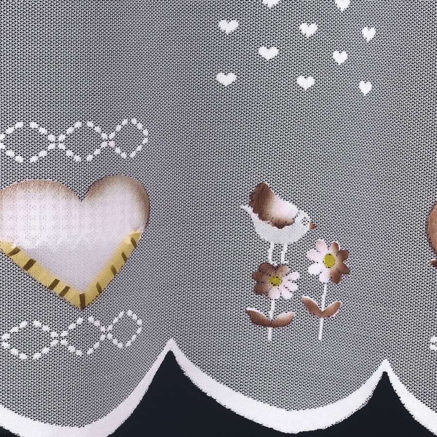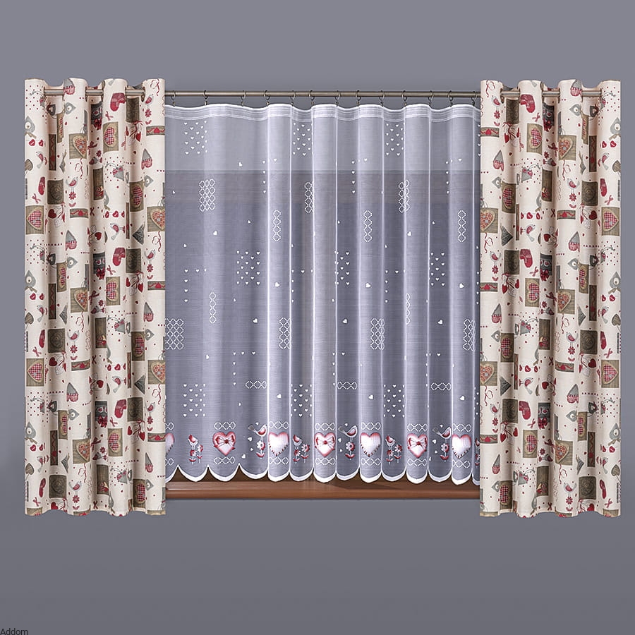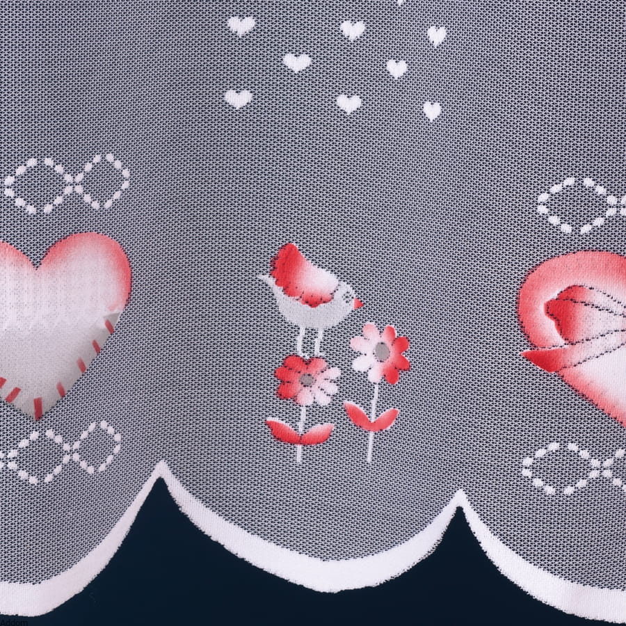 Firanki żakardowe z białej nici, z wzorami w ptaszki i serduszka, które malowane są dołem na czerwono lub brązowo. Firany sprzedawane na metry, mają wysokość 160 cm, a farby użyte do malowania wzorów są wodoodporne, więc nie musimy się obawiać, że będą farbować lub że spiorą się po praniu.