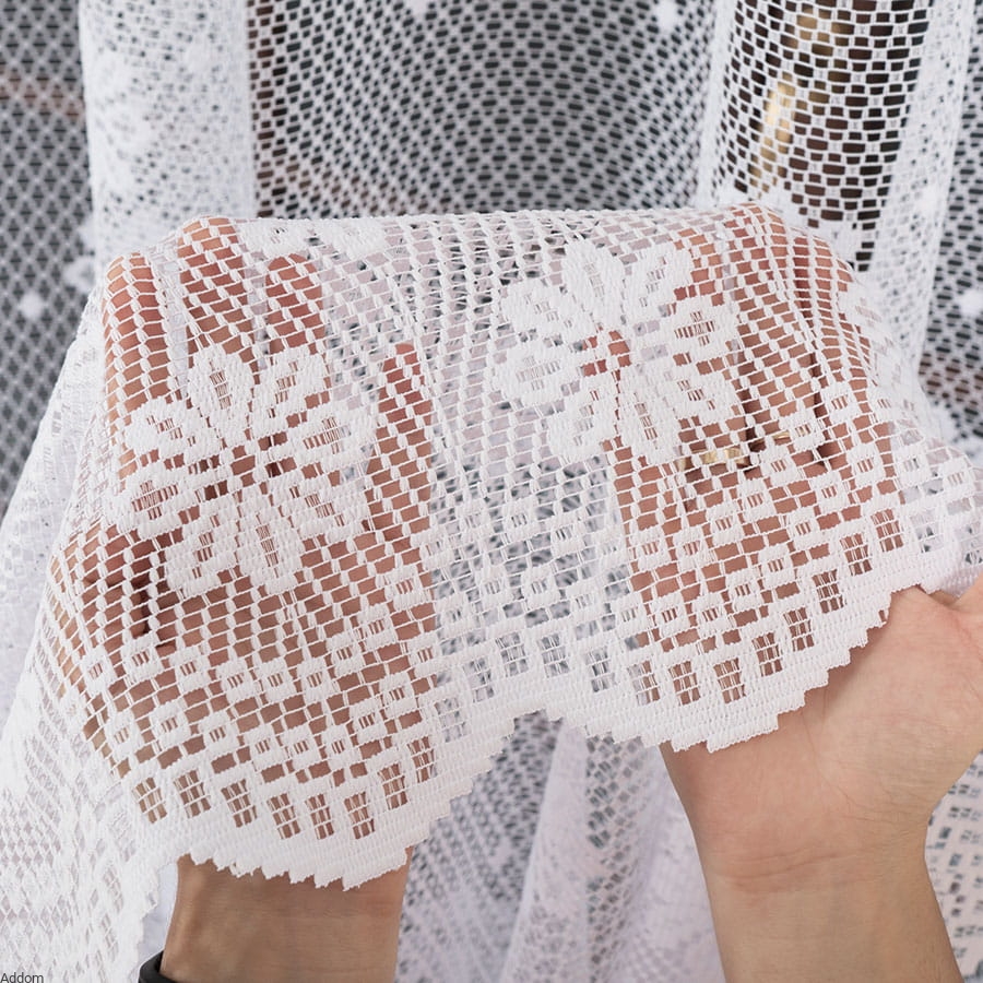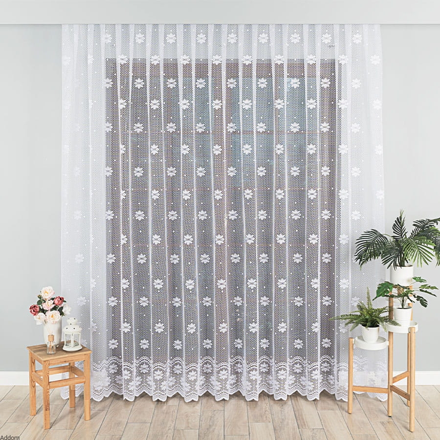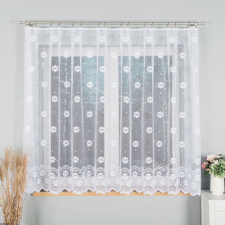 Firanki żakardowe sprzedawane na metry, w kwiatki stokrotki, które zdobią głównie dolną część firan, a górą znajdują się rzadziej rozmieszczone główki tych kwiatów. Firaneczki te sprzedajemy na metry, tak jak zazdrostki do nich, co sprawia, że można z nich zaplanować sobie skomponowanie sobie zgrabnego kompleciku firan do kuchni.