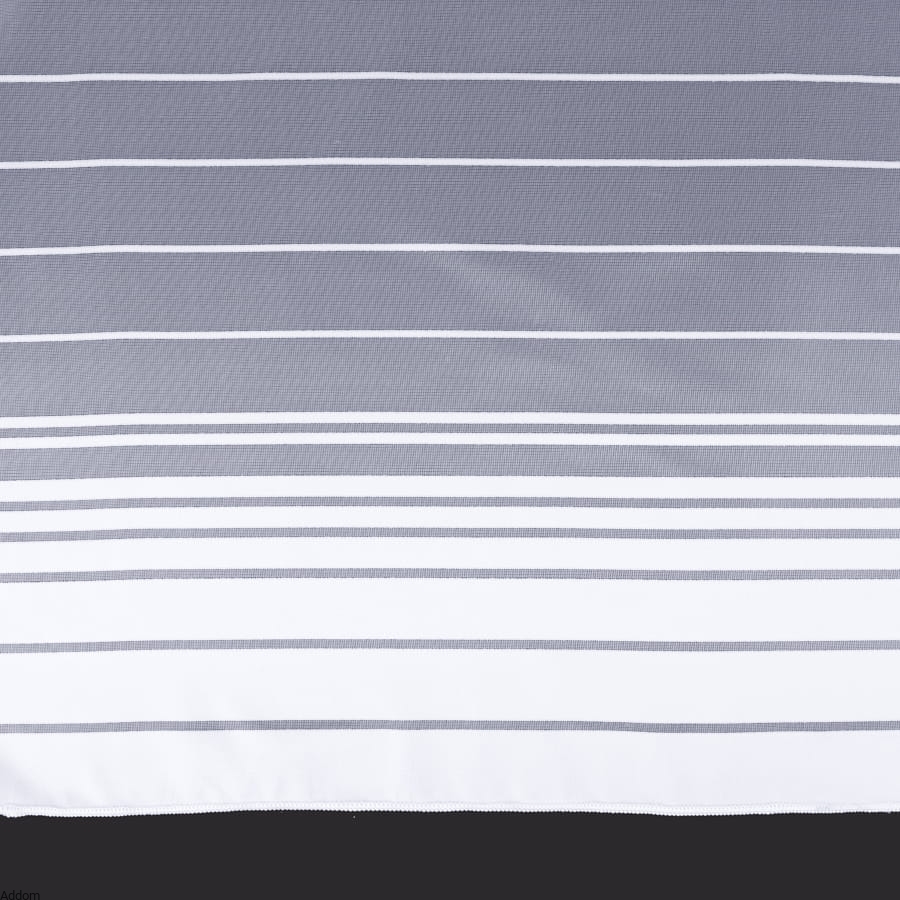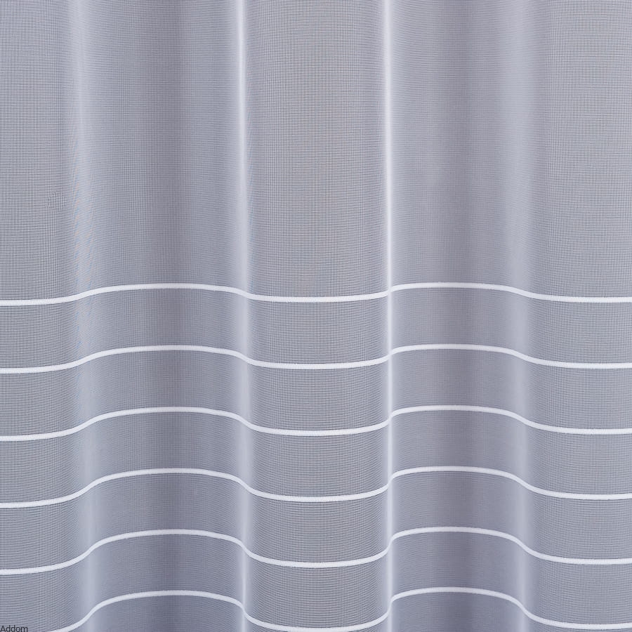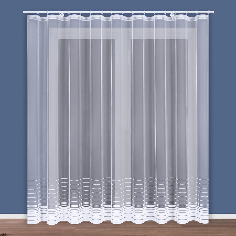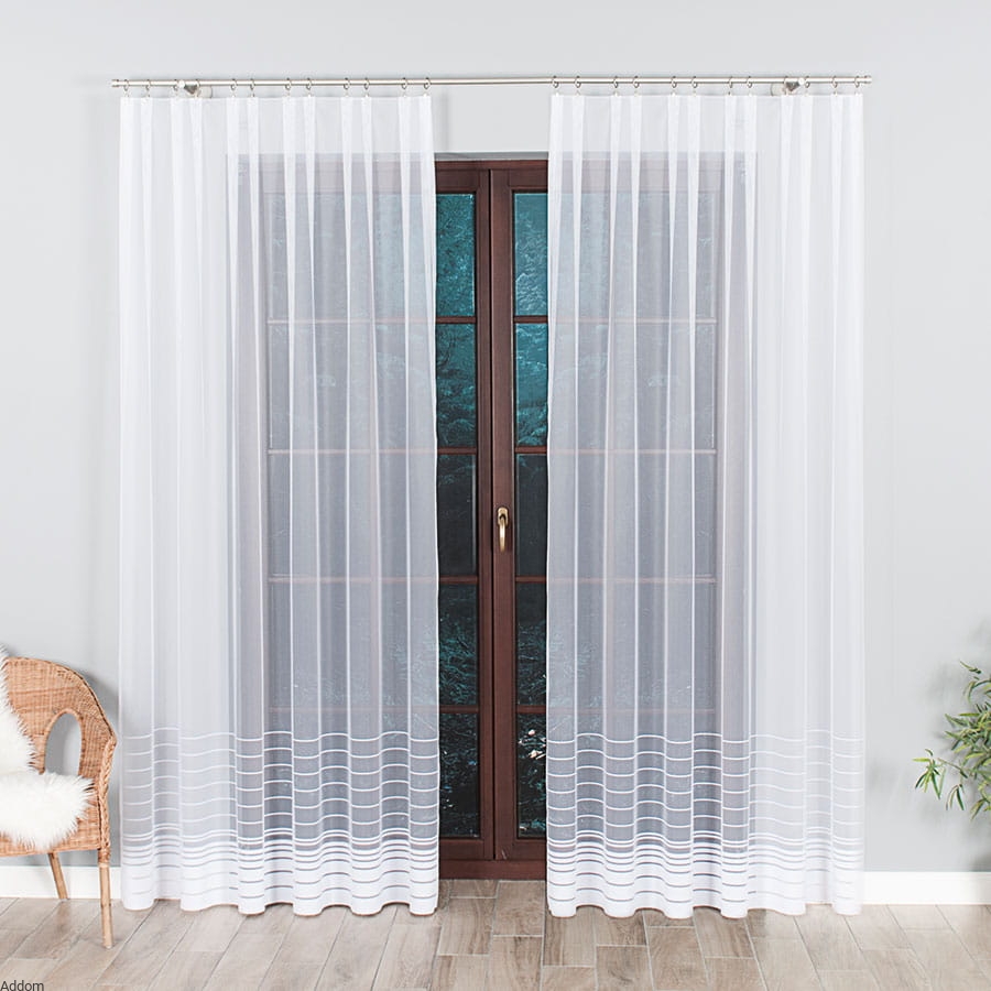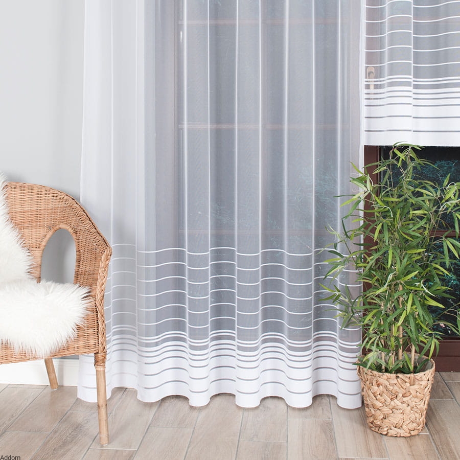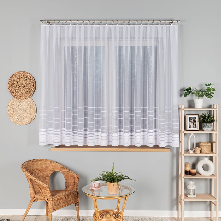 Firanki gotowe o prostym fasonie, prostych paseczkach w dolnej części firany, na samym dole pas biały szeroki, wykończony ołowianką zaszytą sznureczkiem, która świetnie obciąga firany w dół. Tło jest gładziutkie i białe, dolne 3 paski są szersze i mają 5 cm szerokości, kolejne paseczki mają po 2 cm szerokości, a następnie przechodzą w bardzo cienkie paseczki.