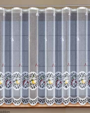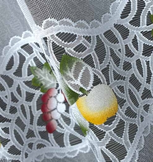 Firanki w kolorowe owoce, jabłuszka, cytrynki i inne, przecięte na pół, ukazujące ich apetyczne wnętrze. Kolory są nasycone i ciepłe, w chromoterapii, sprzyjające apetytowi i dobremu trawieniu, wprowadzają też optymistyczny nastrój. Ich wysokość w najdłuższym miejscu to 150 cm, a szerokość w opcjach wyboru podajemy przed zmarszczeniem. Firany te są żakardowe, a wzory wykonane są nicią, następnie są one barwione ręcznie farbami wodoodpornymi.