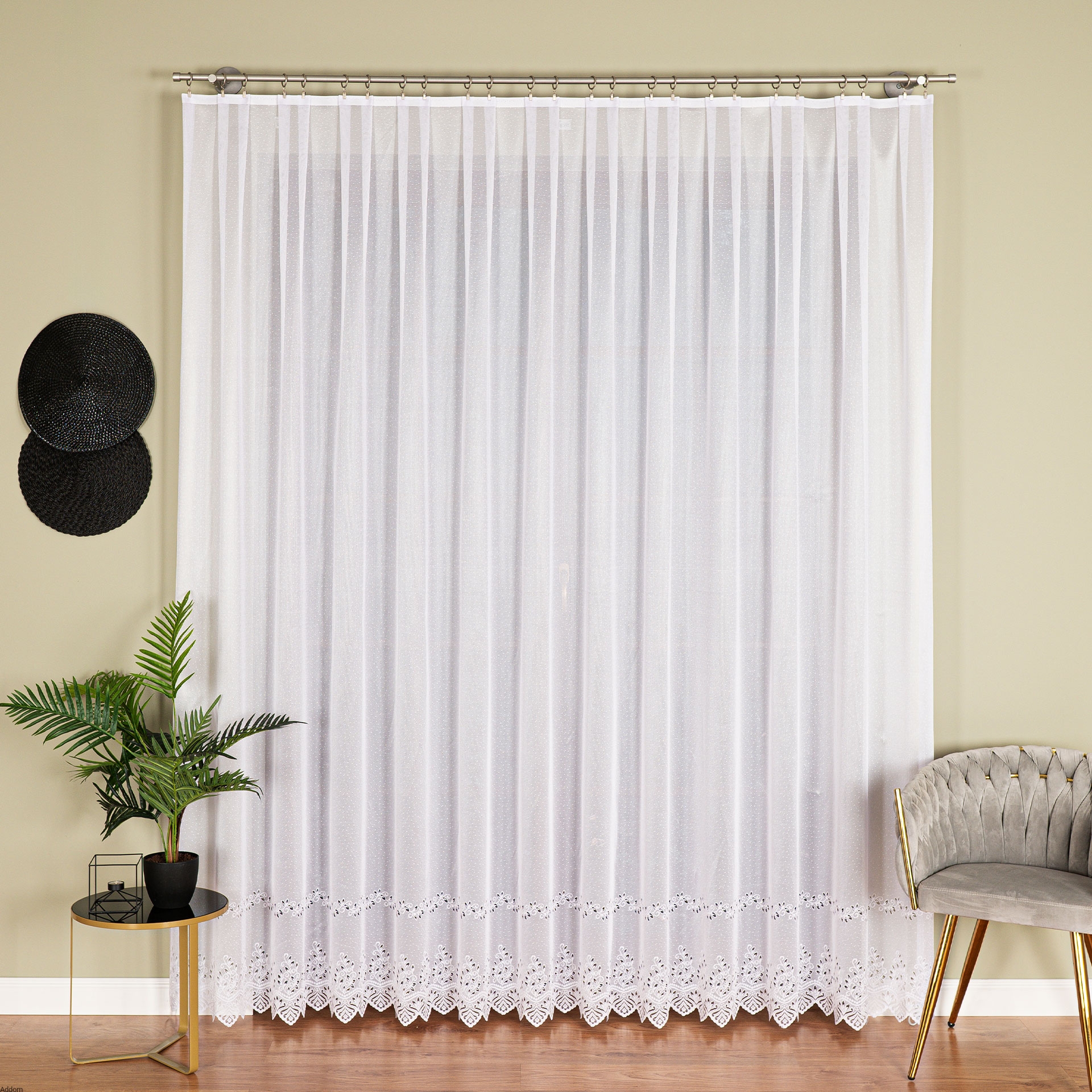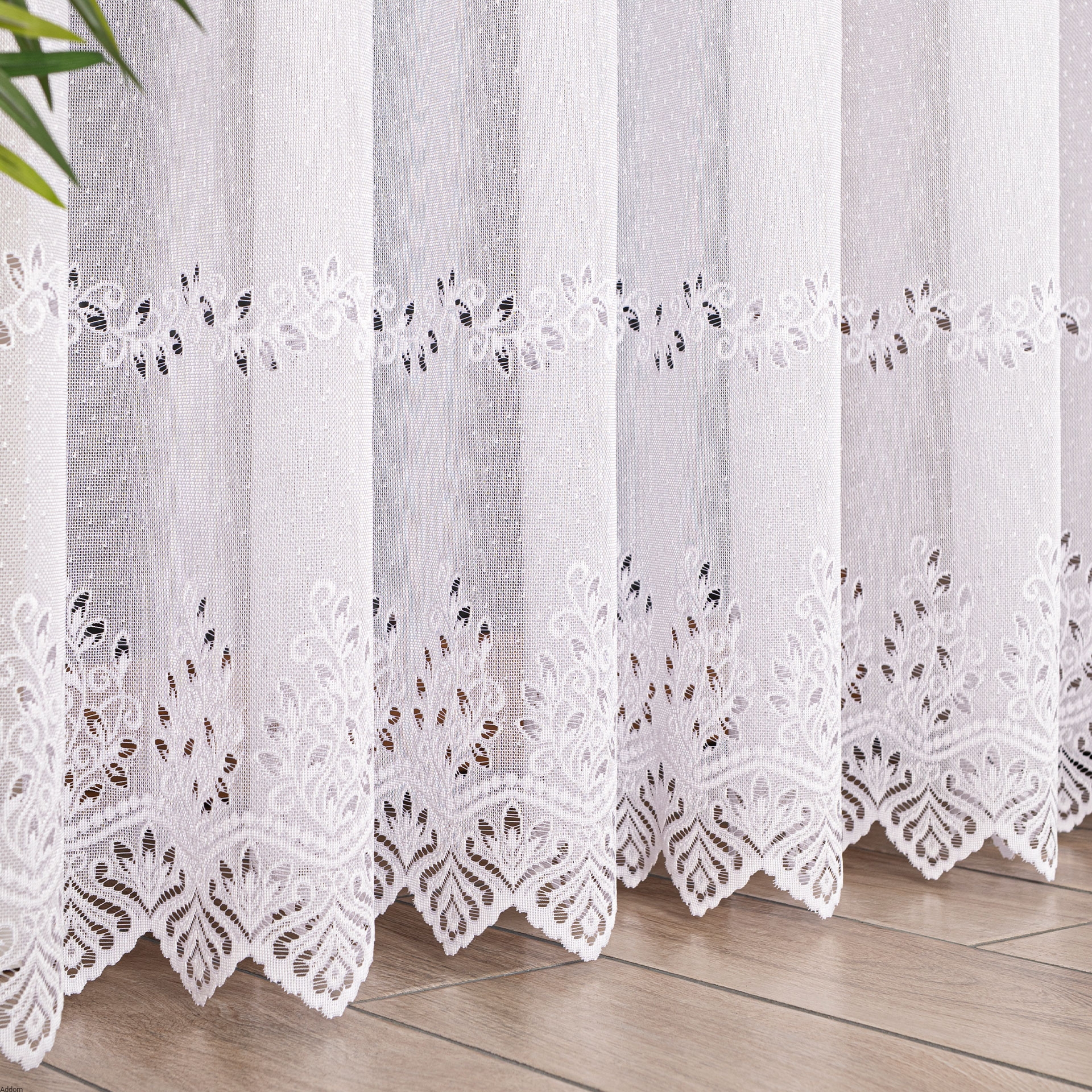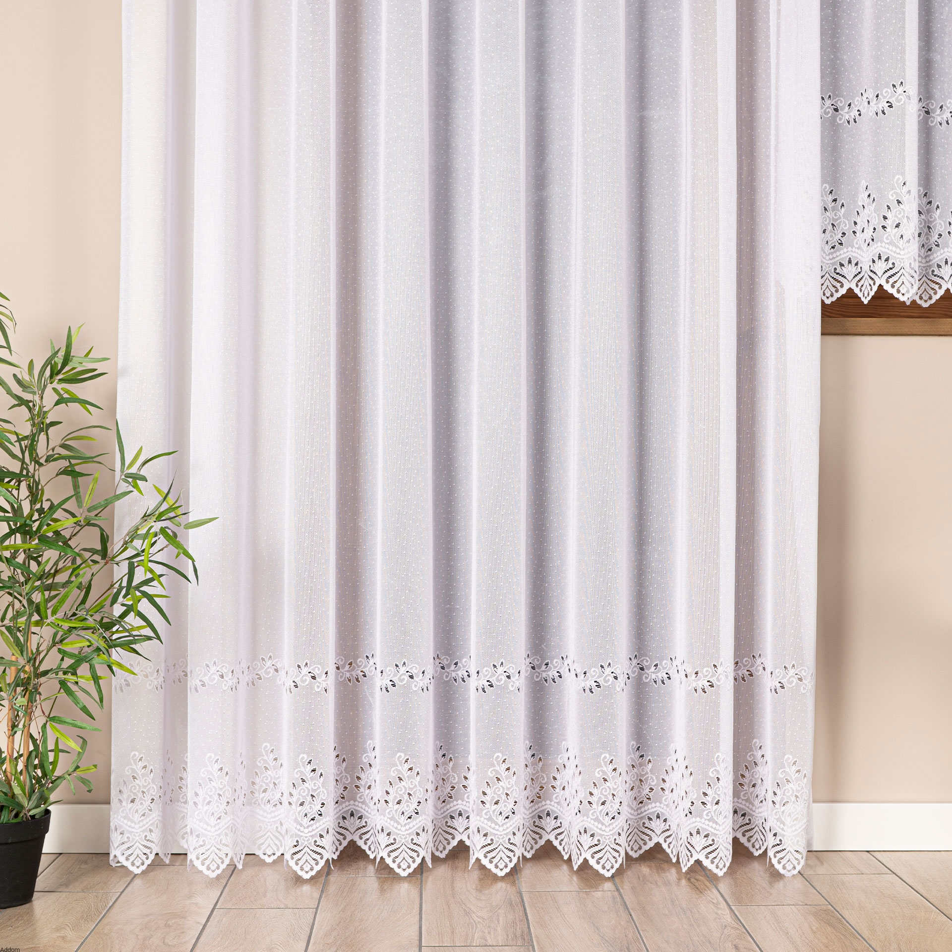 Firanki proste dołem, z których zestawić można komplet firan do drzwi i okien balkonowych. Firanki są żakardowe i są oferowane zarówno w wersji długiej jak i krótkiej z prostym dołem, bez łuków, udekorowanym eleganckim szlakiem roślinnym. Firanki są uszyte z taśmą marszczącą. Wzory w formie otworów, wyraziste, matowe, tło gęste, mleczne.