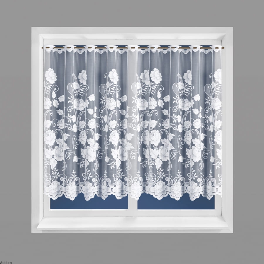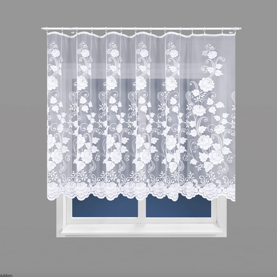 Firanki zdobione dość sporymi kwiatami, prawdopodobnie różami pnącymi się od góry do dołu na przejrzystym tle żakardu. Firanki są bardzo tradycyjne, klasyczne, sprawiają wrażenie swojskich firan ale dostojnych. Idealne do wnętrz, w których królują róże. Taki wzór dobrze osłania przed tym, co za oknem, ale przepuszcza światło, przy czym krótkie firanki są całe mocno wzorzyste, wysokie są wzorzyste do 3/4 wysokości, góra zawiera też wzory, lecz jest ich mniej.
