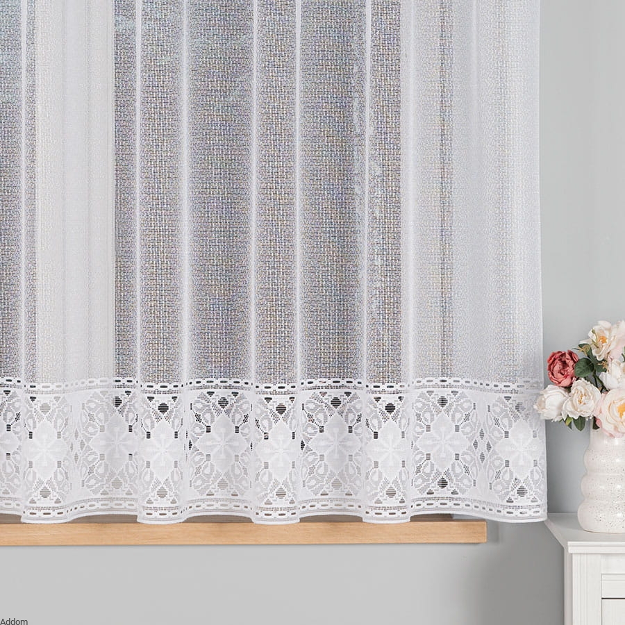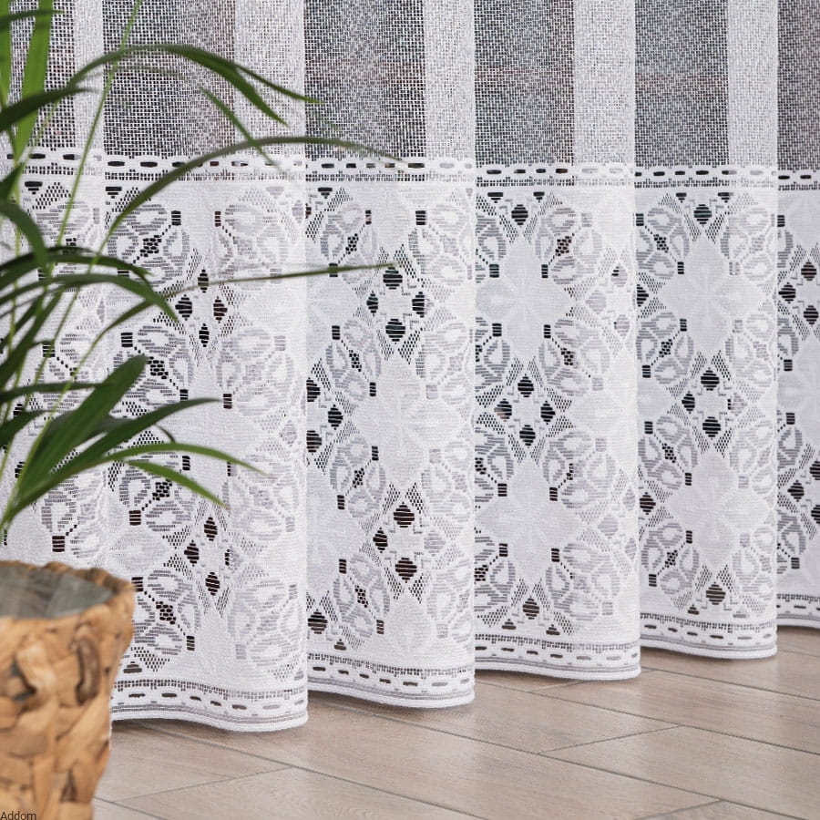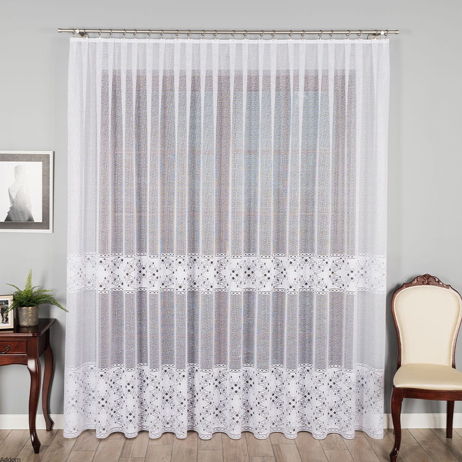 Firanki żakardowe z przejrzystą górą, a dołem wykończone białym, szerokim pasem. Generalnie firany są z 2 białymi pasami dekorującymi dół w każdej wersji wysokości, natomiast w wariancie krótkim na 160 cm pas jest jeden, wykończający dół.