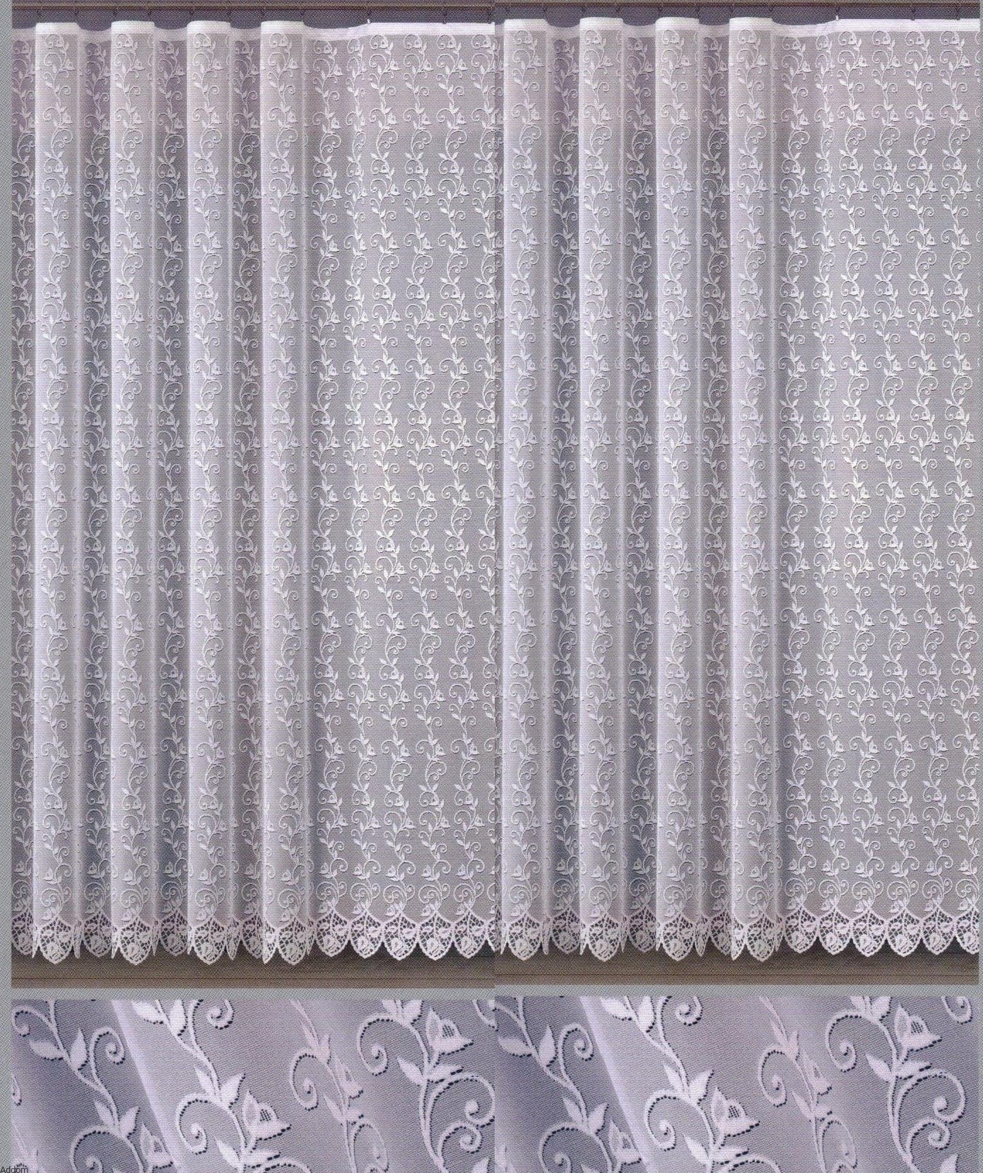 Firany o szerokiej gamie rozmiarów, z których można złożyć sobie komplet balkonowy, taki jak na zdjęciu, kupując pojedyncze, gotowe elementy, z których każdy jest uszyty na takiej samej taśmie marszczącej. Firany mają wzór roślinny, roślinki pną się w górę, a na uwagę zasługuje również dolne wykończenie firanki, które jest finezyjne. Firany wykonane są z wyjątkowo gęstej dzianiny. Ta wysokiej jakości dzianina wyprodukowana w kaliskiej fabryce jest trwała, gęsta i zwięzła.