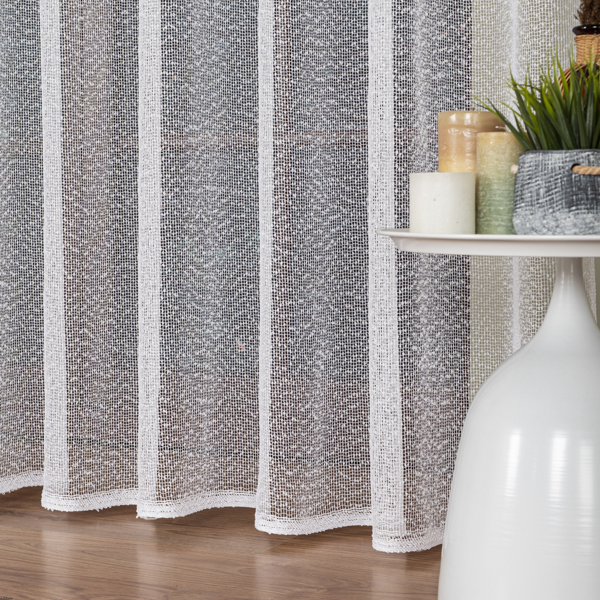 Srebrna lub złota nić gra w firanie pierwsze skrzypce, tworząc połyskujące paseczki, zaś na samym dole firany znajduje się obciążnik, który odpowiada za idealne ułożenie firany.