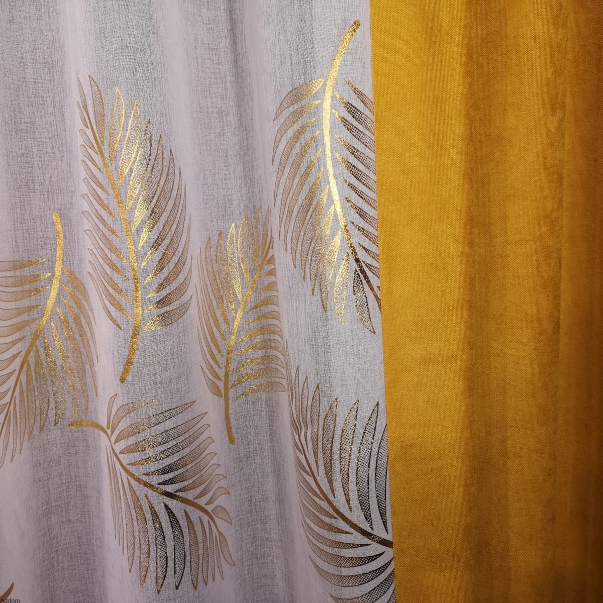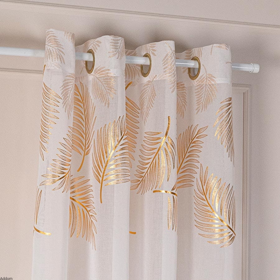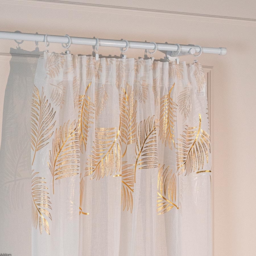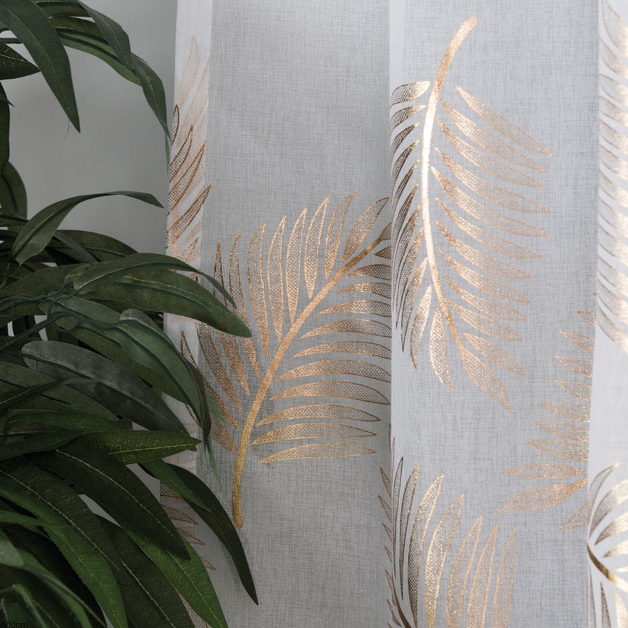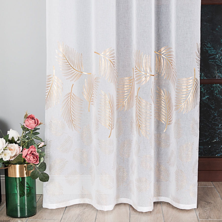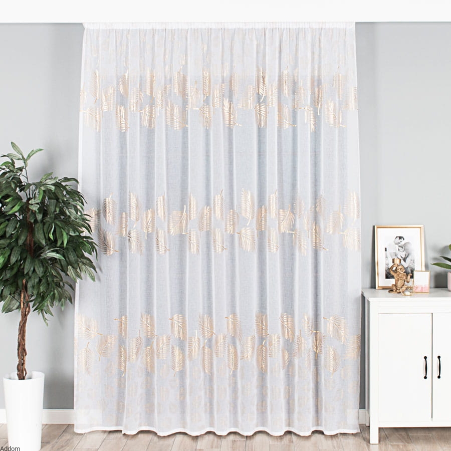Firany w złote wzory, w formie 3 rzędów złotych liści, szyte z tkaniny podobnej do lnu, dekorowanej dużymi, złotymi liśćmi paproci czy palm, uszyte na taśmie o szerokości 8 cm, która umożliwia wieszanie firan na wiele sposobów - z tyłu ma szelki do nasuwania firany na drążek, dzięki czemu firanę można wieszać zarówno na żabkach, haczykach, jak i nasuwać na drążek za pomocą krytych z tyłu szelek, uzyskując efekt przelotki.