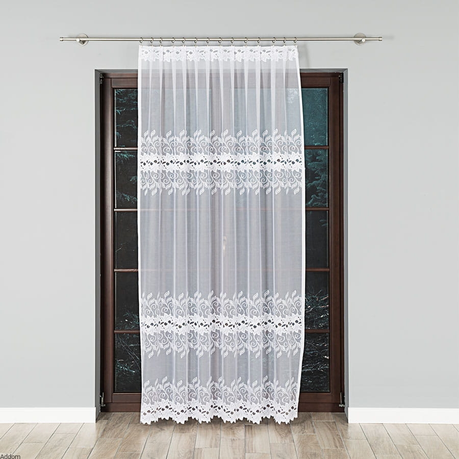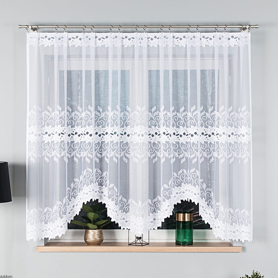 Eleganckie i efektowne firanki żakardowe, z 2 niewielkimi falami, które wykończone są bardzo gęstymi liśćmi. Co ciekawe w tej firance, to technika piezzo, czyli nić nabłyszczana prowadzona tak, że daje efekt malowania mrozem, która wypełnia dekorujące ją listki. Nić ta połyskuje pomiędzy matowym tłem wzoru. Wzory w tych firankach to liście, ale bardzo gęsto układane, że tworzą solidny, bardzo rzucający się w oczy wzór, wkomponowany w gładkie tło. Wzory zostawiły miejsce na otwory, tworząc dodatkowe, ażurowe wzory, imitujące wzór Richelieu.
