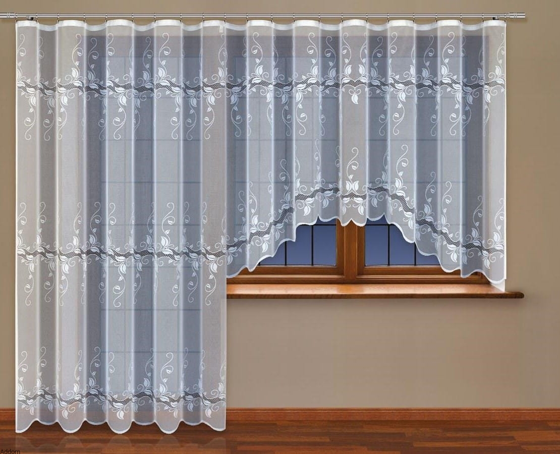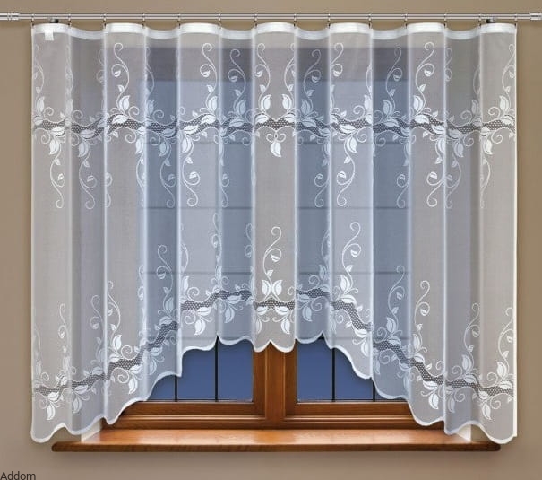 Firany gotowe z ażurowym pasem, z którego górą i dołem rozpościerają się listki. Firanki te są subtelne, romantycznie dekorowane listkami, z których wiją się spiralne pędy. Występują one w kilku wersjach - firanki wysokie w 2 wersjach wysokości, a krótkie w 2 wersjach szerokości. Wszystkie mają taśmy marszczące, krótkie firanki mają ładny, łagodny podkrój, w formie łagodnego łuku.