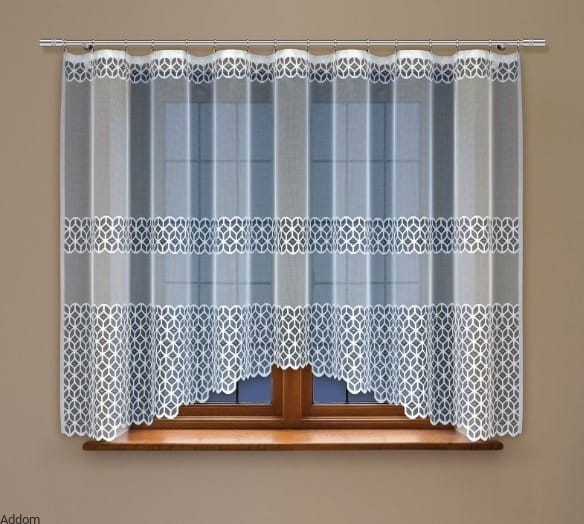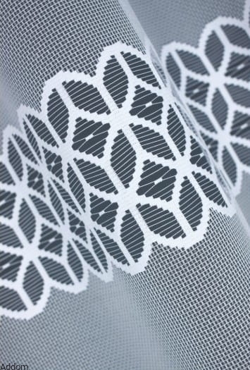 Firany gotowe z geometrycznym ażurem, konfekcjonowane, uszyte na taśmie, jak wszystkie firany marki Haft. Firany te mają bardzo ciekawy motyw dekoracyjny - 3 rzędy ażuru, złożonego z owali pionowych, w których zamknięte są romby. Patrząc z innej strony, widzimy w nich kwiaty o 4 listkach, które stykają się z sobą. Wzory geometryczne tworzą wzory kwiatowe - jak w Świętej Geometrii, nie ma przypadkowości, z prostych wzorów powstaje bardzo dużo innych wzorów, wystarczy je dostrzec. Firany te mają charakter dość nowoczesny, jednak ich unikalny wzór sprawdzi się w wielu stylizacjach.