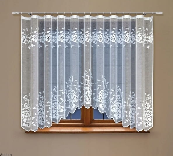 Firanki gotowe z szerokim zdobieniem we wzory kwiatowe, o szerokości 300 cm lub 400 cm, wysokość 160 cm, fabrycznie wykończone, z lekkim podkrojem z szerokim pasem dekoracyjnym w formie gęstego łuku wykonanego z kwiatów. Firanki zapakowane są w gustowną torebkę z uszkiem i zdjęciem, może stanowić pomysł na prezent, mają wszytą taśmę marszczącą.
